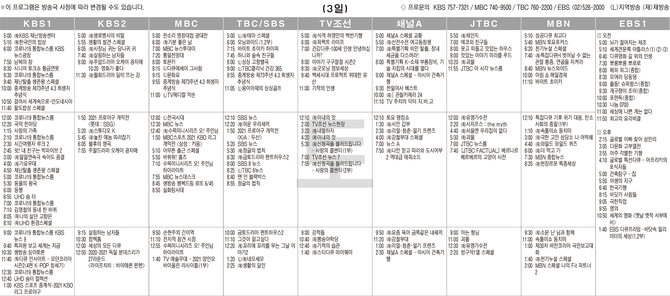 카카오톡 페이스북 트위터 전체 네이버밴드 네이버블로그 4월3일(토) TV 편성표 박성희 기사 전체보기 영남일보(www.yeongnam.com), 무단전재 및 수집, 재배포금지 연예인기뉴스
