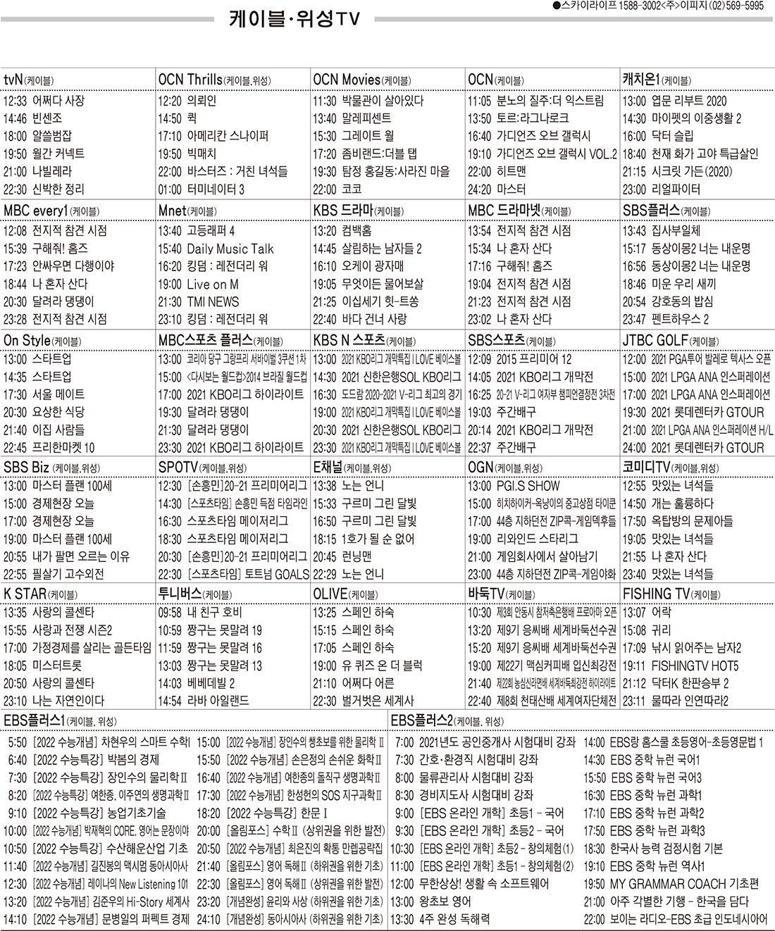 카카오톡 페이스북 트위터 전체 네이버밴드 네이버블로그 4월5일(월) 케이블·위성TV 편성표 박성희 기사 전체보기 영남일보(www.yeongnam.com), 무단전재 및 수집, 재배포금지 연예인기뉴스