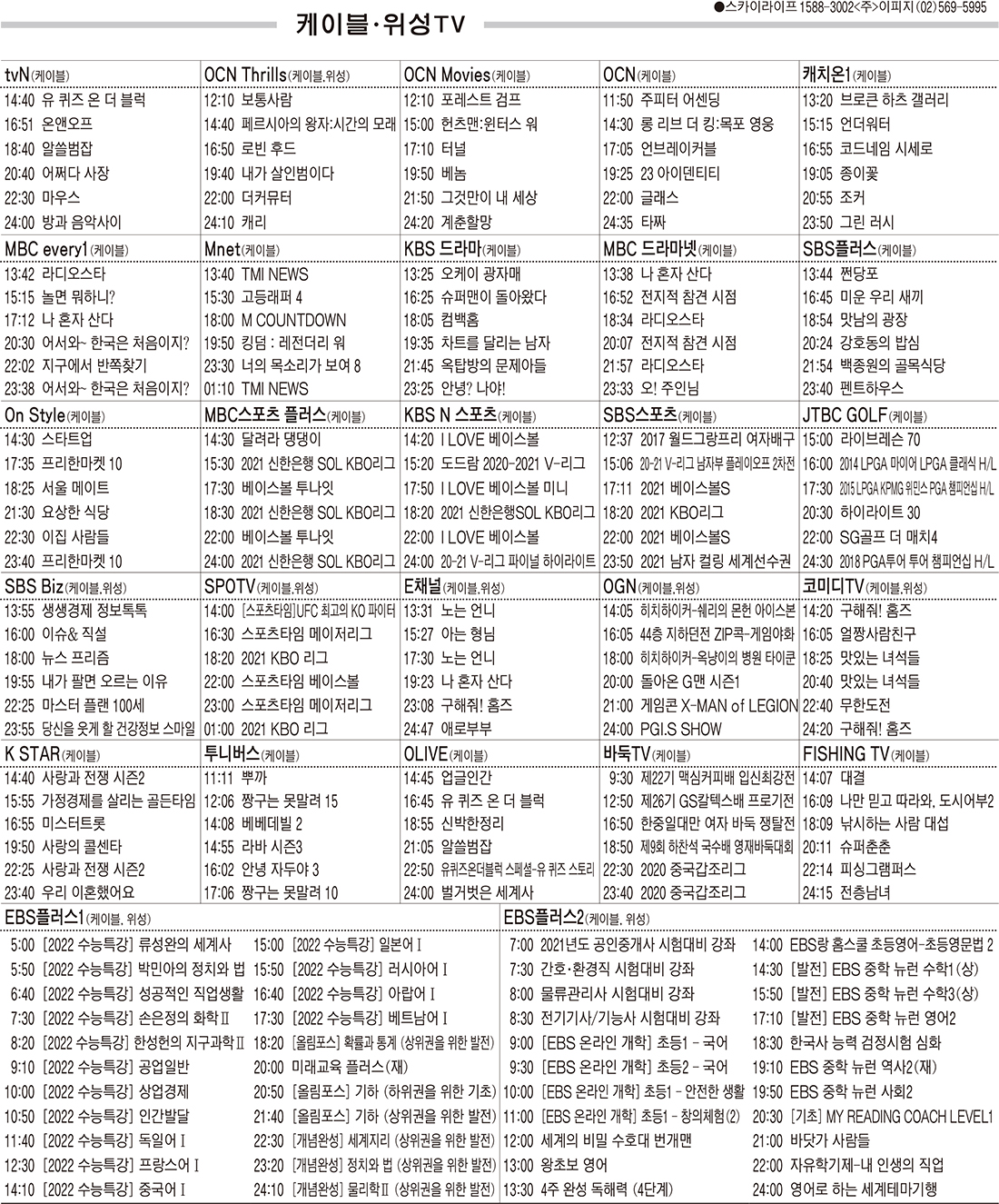 카카오톡 페이스북 트위터 전체 네이버밴드 네이버블로그 4월8일(목) 케이블·위성TV 편성표 박성희 기사 전체보기 영남일보(www.yeongnam.com), 무단전재 및 수집, 재배포금지 연예인기뉴스