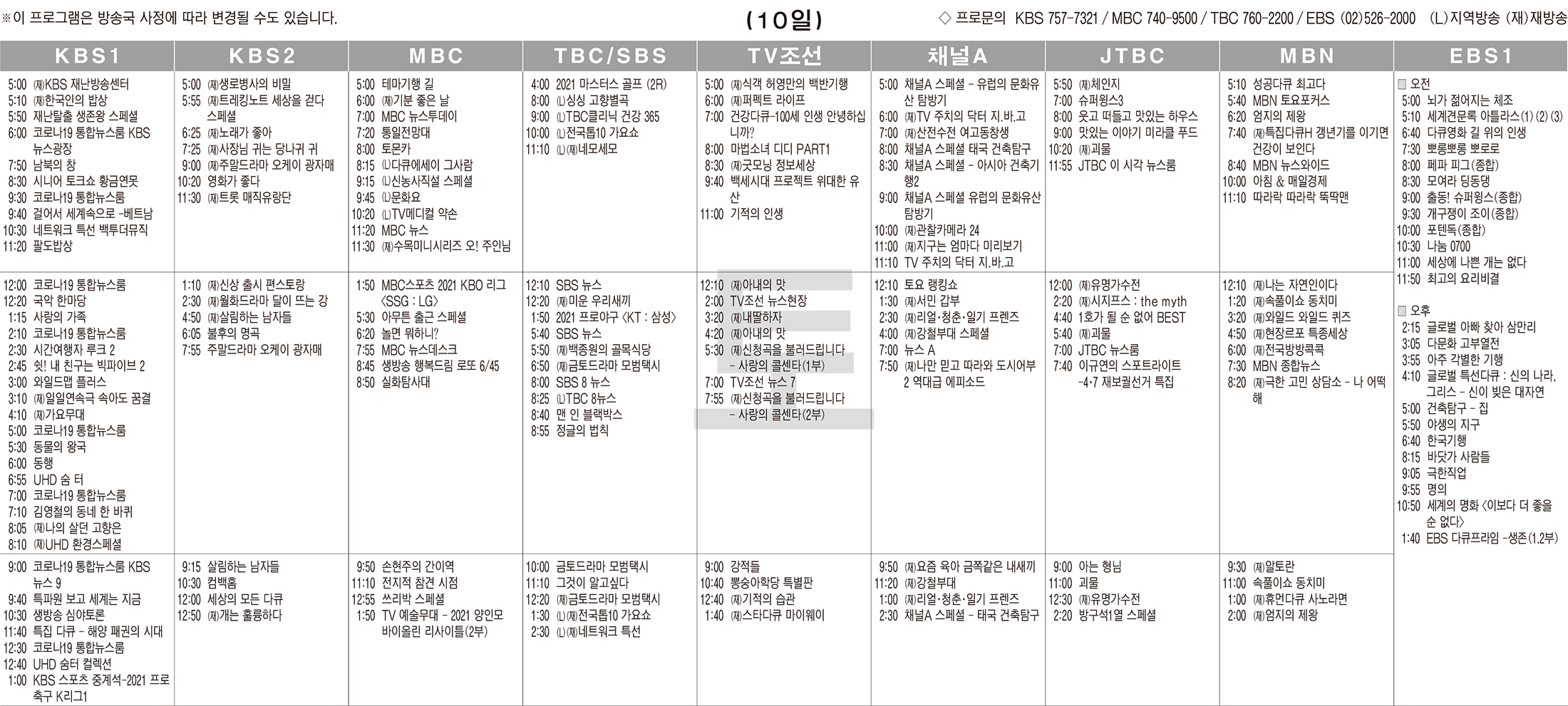 카카오톡 페이스북 트위터 전체 네이버밴드 네이버블로그 4월10일(토) TV 편성표 박성희 기사 전체보기 영남일보(www.yeongnam.com), 무단전재 및 수집, 재배포금지 연예인기뉴스