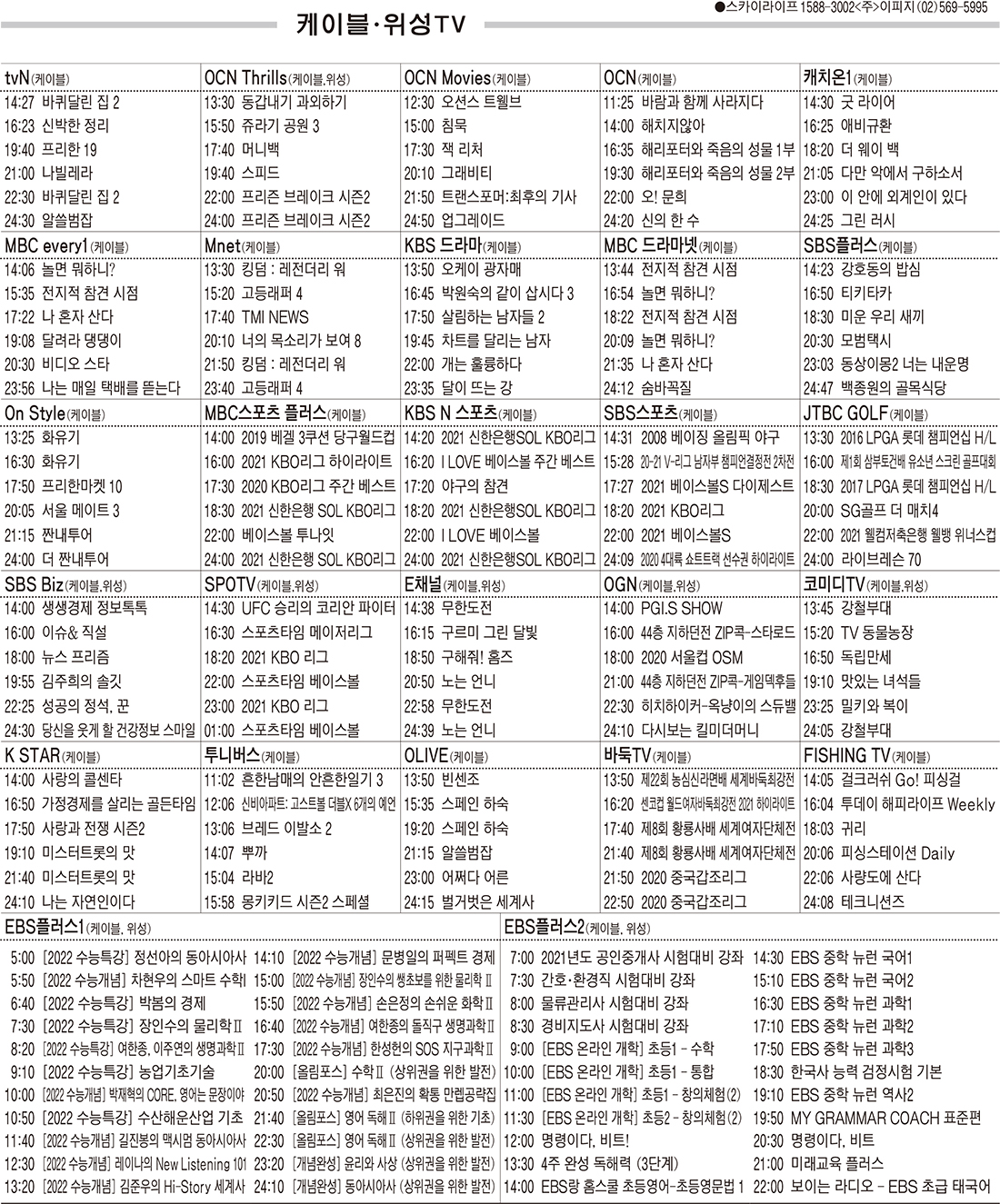카카오톡 페이스북 트위터 전체 네이버밴드 네이버블로그 4월13일(화) 케이블·위성TV 편성표 박성희 기사 전체보기 영남일보(www.yeongnam.com), 무단전재 및 수집, 재배포금지 연예인기뉴스