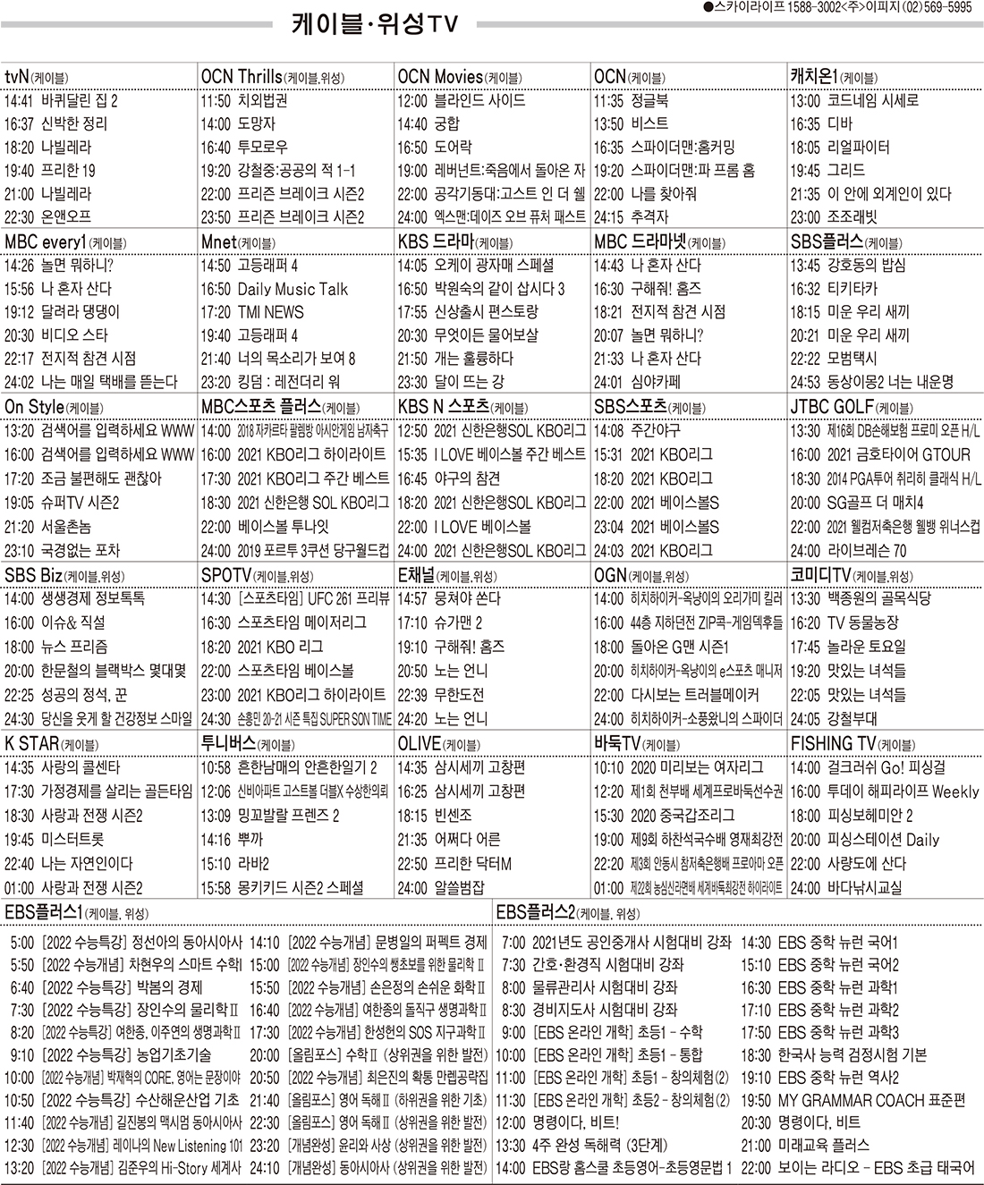 카카오톡 페이스북 트위터 전체 네이버밴드 네이버블로그 4월20일(화) 케이블·위성TV 편성표 박성희 기사 전체보기 영남일보(www.yeongnam.com), 무단전재 및 수집, 재배포금지 연예인기뉴스