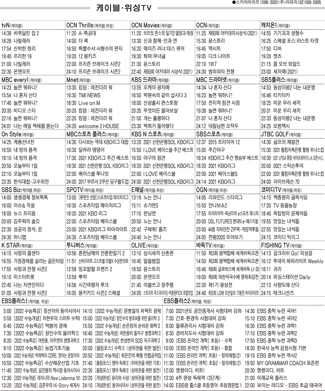 카카오톡 페이스북 트위터 전체 네이버밴드 네이버블로그 4월27일(화) 케이블·위성TV 편성표 박성희 기사 전체보기 영남일보(www.yeongnam.com), 무단전재 및 수집, 재배포금지 연예인기뉴스