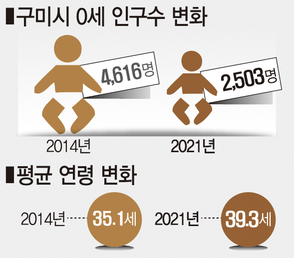 출생아 감소는 구미시민 평균 연령에도 영향을 미쳐 최근 7년간 4.2세나 높아졌다. 2014년 3월 구미시 평균 연령은 35.1세였으나 지난달에는 39.3세까지 치솟아 구미시 평균 연령은 올 연말쯤 40세에 이를 것으로 예상된다.