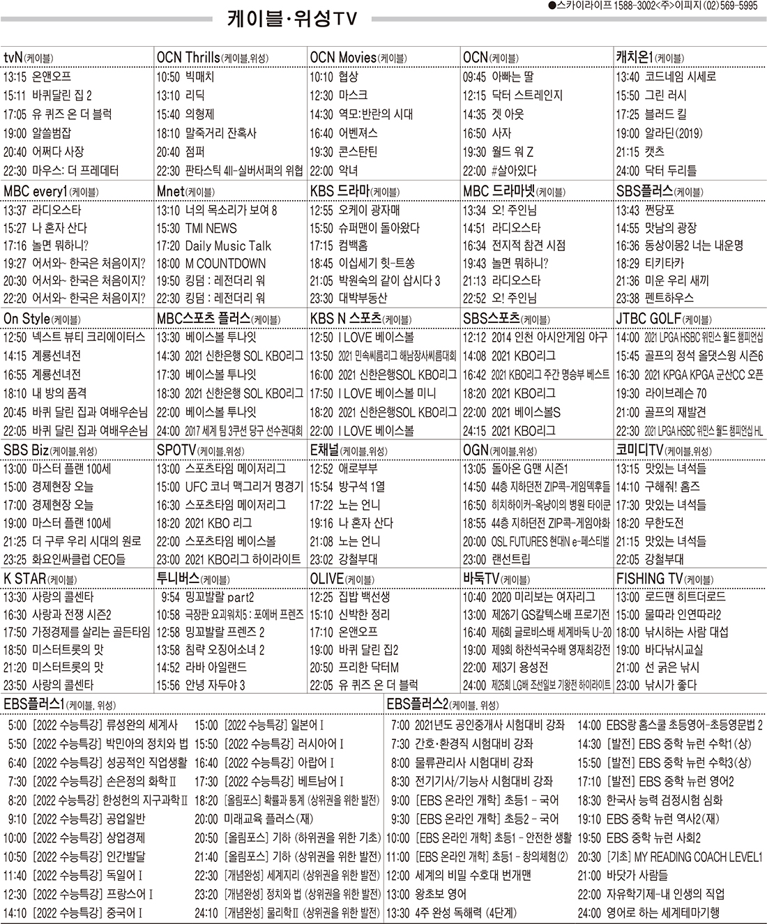 카카오톡 페이스북 트위터 전체 네이버밴드 네이버블로그 4월29일(목) 케이블·위성TV 편성표 박성희 기사 전체보기 영남일보(www.yeongnam.com), 무단전재 및 수집, 재배포금지 연예인기뉴스