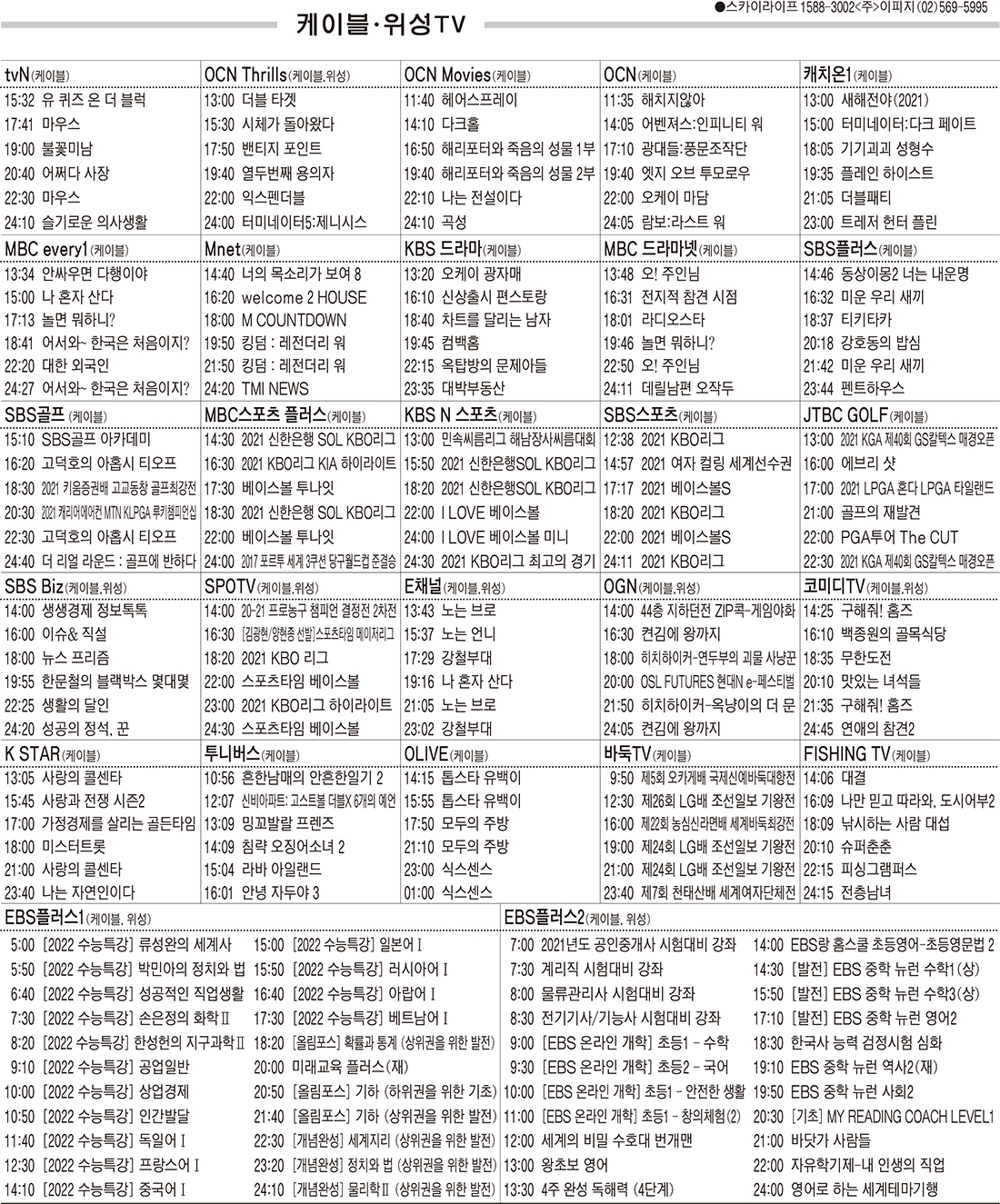 카카오톡 페이스북 트위터 전체 네이버밴드 네이버블로그 5월6일(목) 케이블·위성TV 편성표 박성희 기사 전체보기 영남일보(www.yeongnam.com), 무단전재 및 수집, 재배포금지 연예인기뉴스