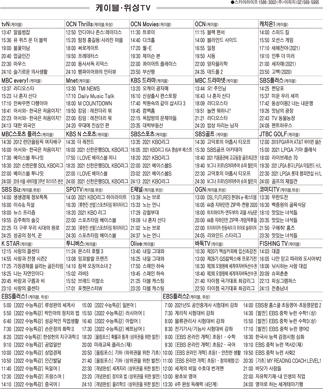카카오톡 페이스북 트위터 전체 네이버밴드 네이버블로그 5월13일(목) 케이블·위성TV 편성표 박성희 기사 전체보기 영남일보(www.yeongnam.com), 무단전재 및 수집, 재배포금지 연예인기뉴스