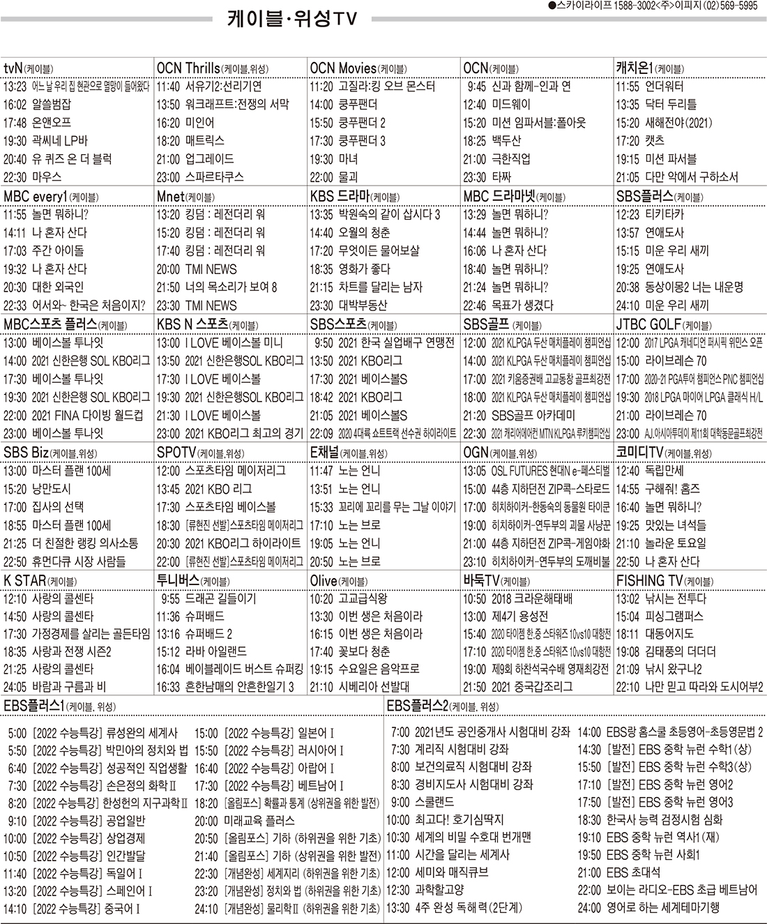 카카오톡 페이스북 트위터 전체 네이버밴드 네이버블로그 5월19일(수) 케이블·위성TV 편성표 박성희 기사 전체보기 영남일보(www.yeongnam.com), 무단전재 및 수집, 재배포금지 연예인기뉴스
