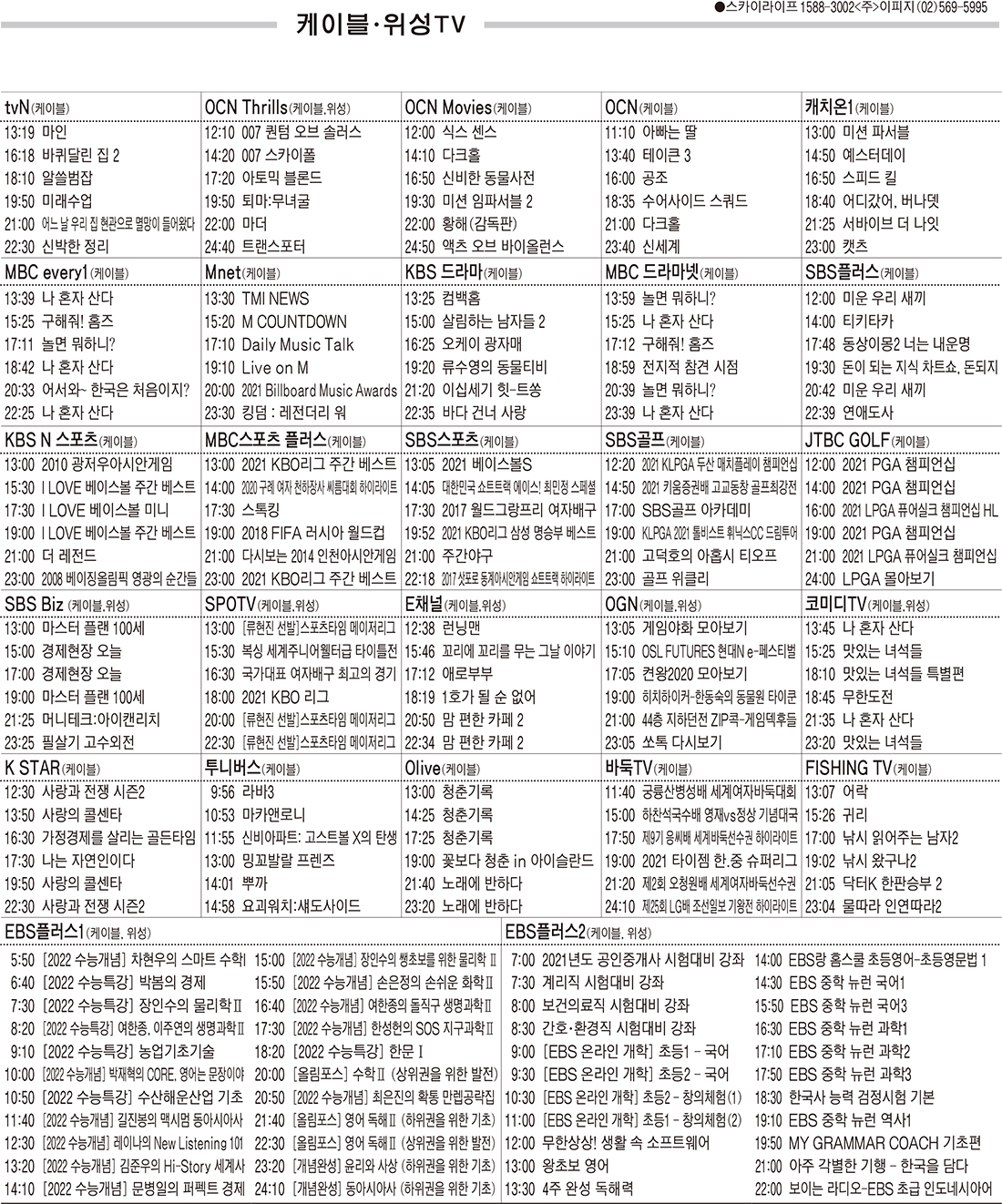 카카오톡 페이스북 트위터 전체 네이버밴드 네이버블로그 5월24일(월) 케이블·위성TV 편성표 박성희 기사 전체보기 영남일보(www.yeongnam.com), 무단전재 및 수집, 재배포금지 연예인기뉴스