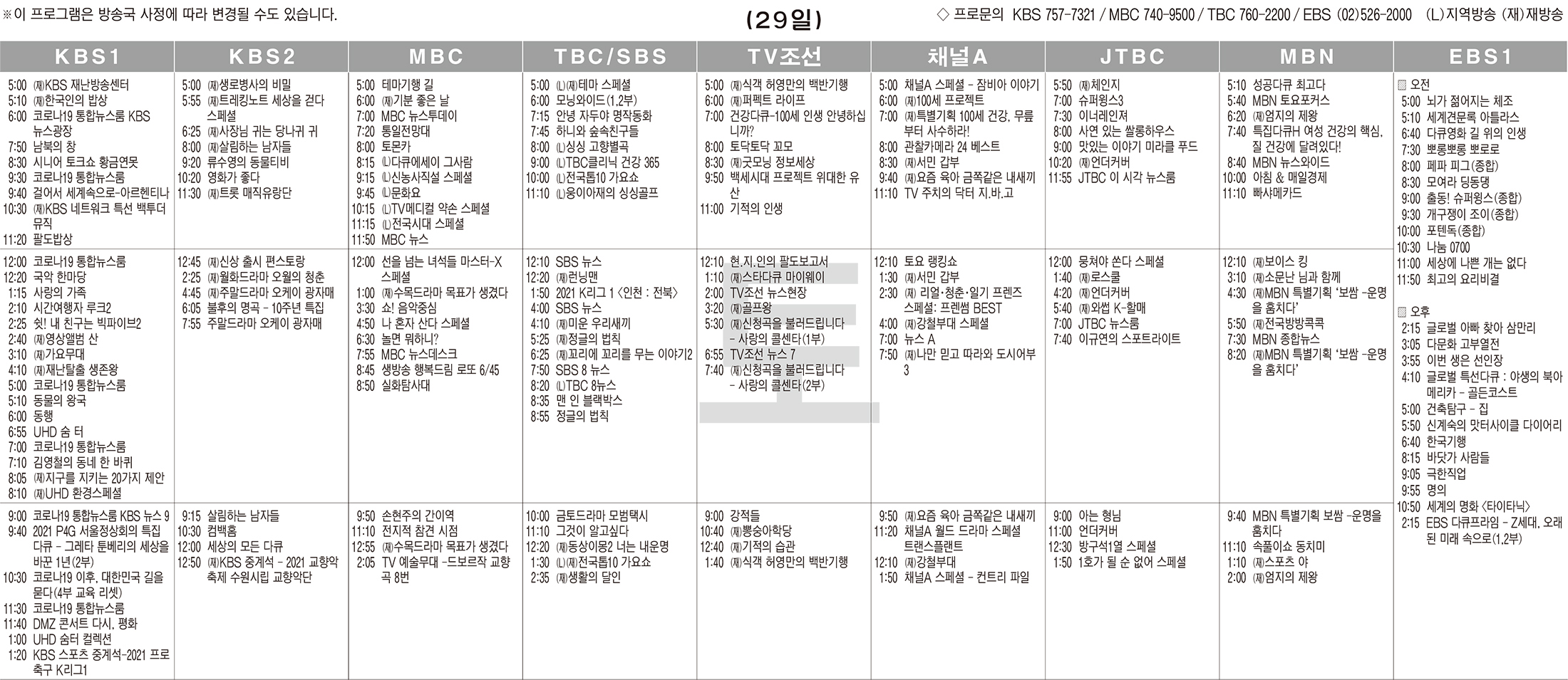 카카오톡 페이스북 트위터 전체 네이버밴드 네이버블로그 5월29일(토) TV 편성표 박성희 기사 전체보기 영남일보(www.yeongnam.com), 무단전재 및 수집, 재배포금지 연예인기뉴스