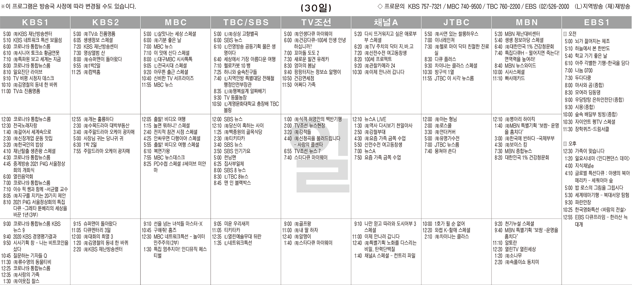카카오톡 페이스북 트위터 전체 네이버밴드 네이버블로그 5월30일(일) TV 편성표 박성희 기사 전체보기 영남일보(www.yeongnam.com), 무단전재 및 수집, 재배포금지 연예인기뉴스
