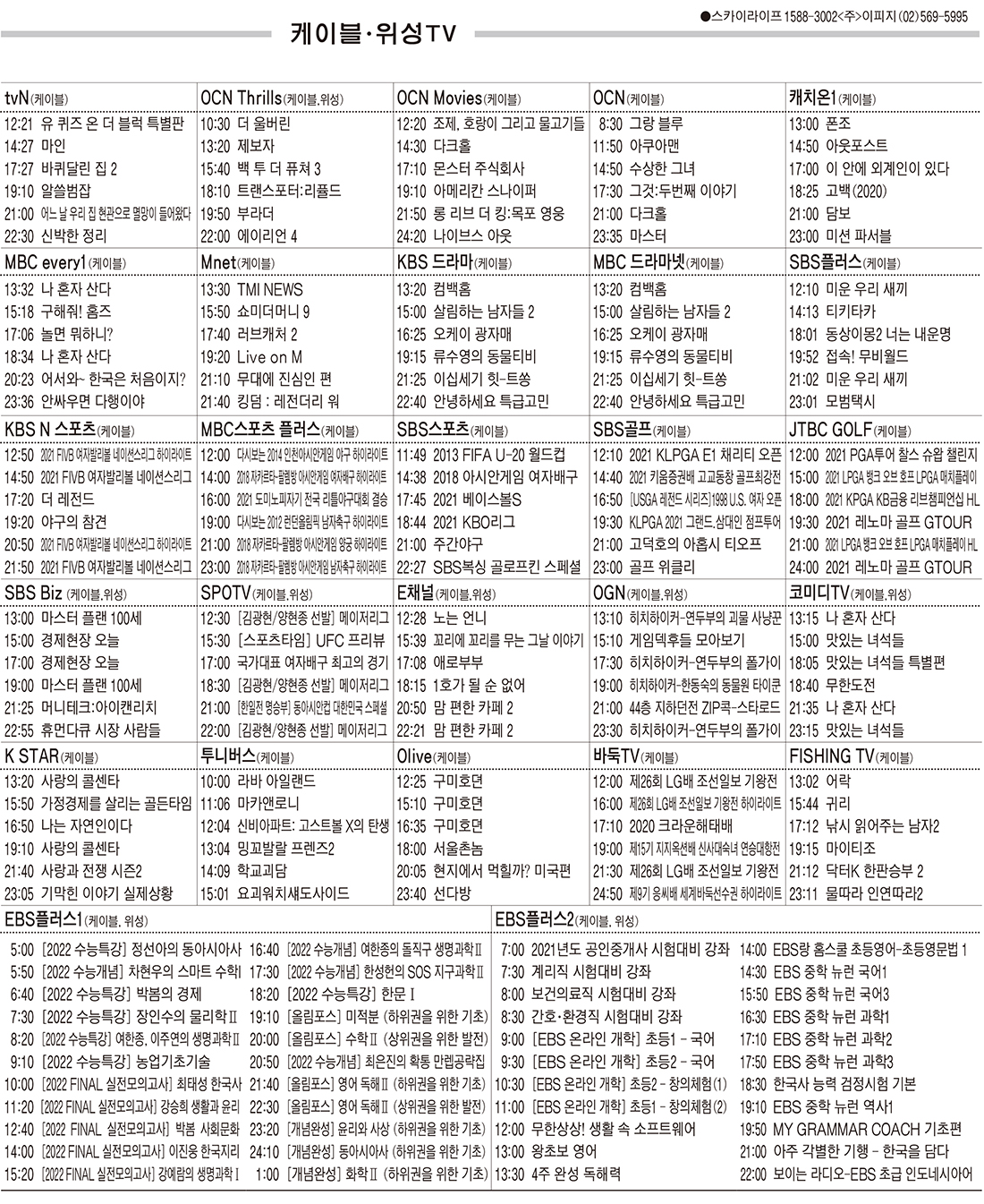 카카오톡 페이스북 트위터 전체 네이버밴드 네이버블로그 5월31일(월) 케이블·위성TV 편성표 박성희 기사 전체보기 영남일보(www.yeongnam.com), 무단전재 및 수집, 재배포금지 연예인기뉴스