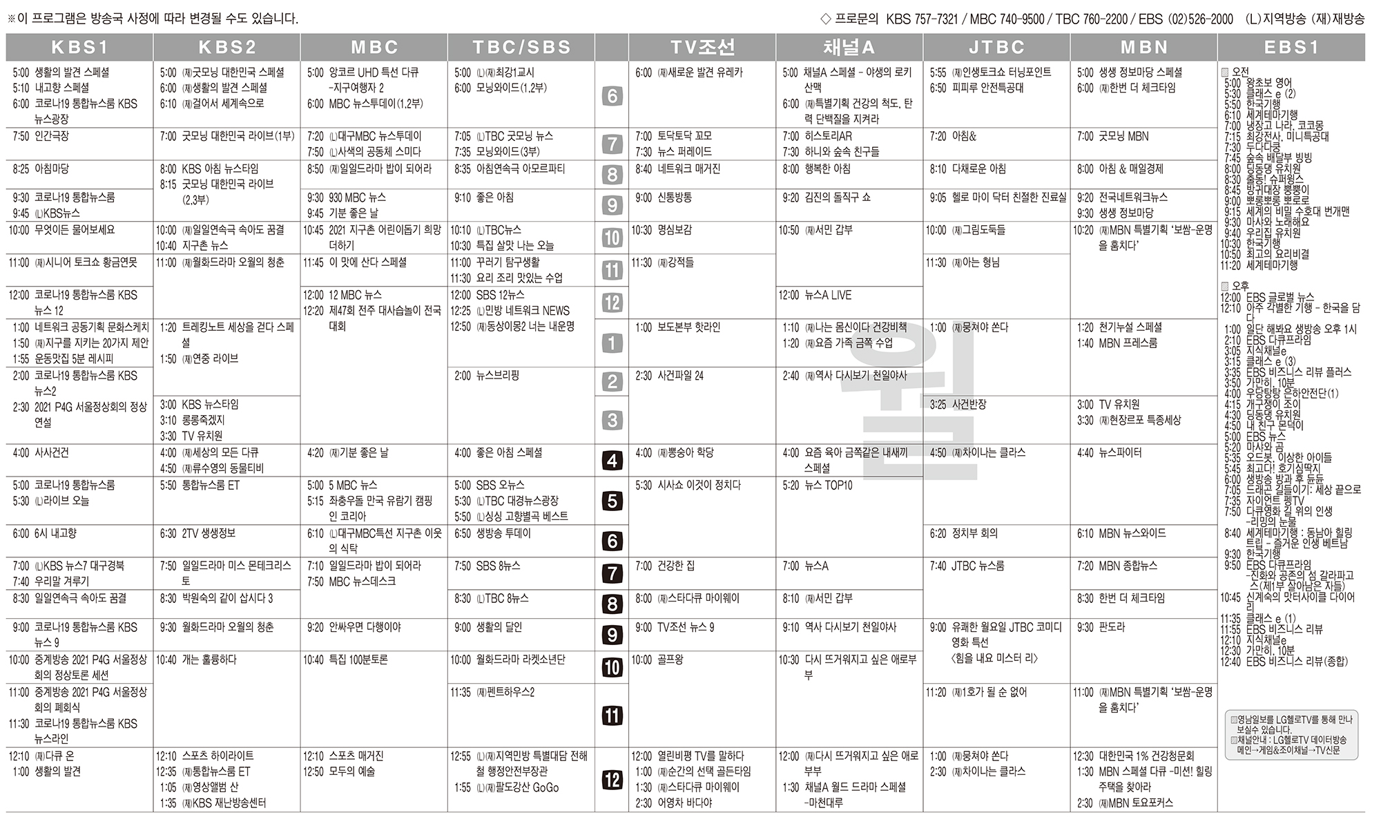 카카오톡 페이스북 트위터 전체 네이버밴드 네이버블로그 5월31일(월) TV 편성표 박성희 기사 전체보기 영남일보(www.yeongnam.com), 무단전재 및 수집, 재배포금지 연예인기뉴스