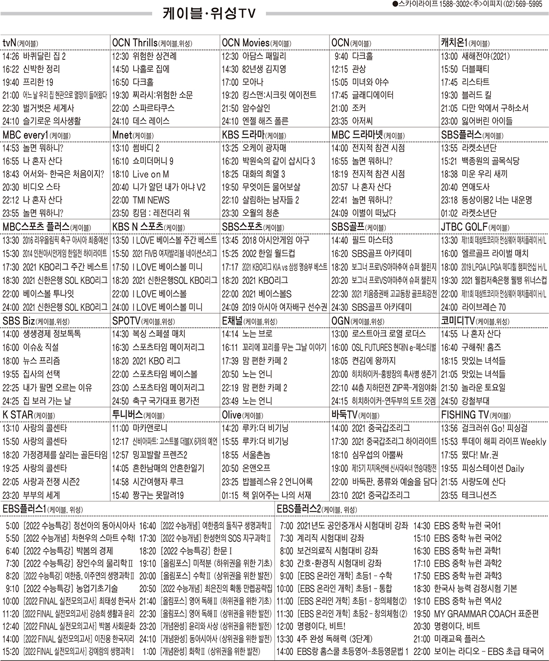 카카오톡 페이스북 트위터 전체 네이버밴드 네이버블로그 6월8일(화) 케이블·위성TV 편성표 박성희 기사 전체보기 영남일보(www.yeongnam.com), 무단전재 및 수집, 재배포금지 연예인기뉴스