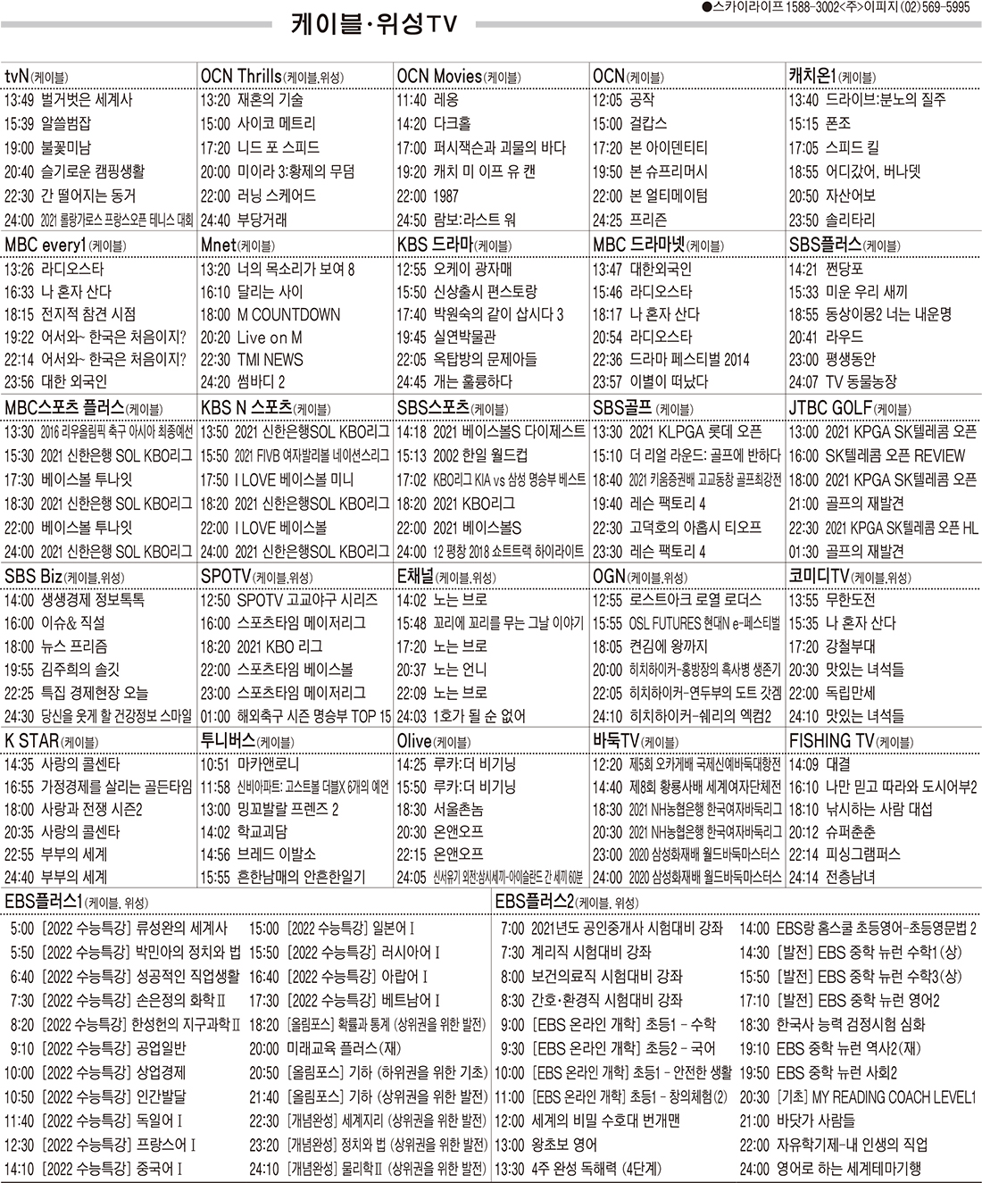 카카오톡 페이스북 트위터 전체 네이버밴드 네이버블로그 6월10일(목) 케이블·위성TV 편성표 박성희 기사 전체보기 영남일보(www.yeongnam.com), 무단전재 및 수집, 재배포금지 연예인기뉴스