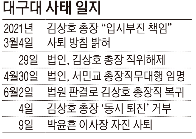 박윤흔 이사장은 지난 11일 담화문에서 "애초 '이사장·총장 동반 퇴진'(영남일보 6월7일자 2면·6월8일자 3면 보도)은 김 총장 측근이 이사회 이사와의 협상과정에 처음 언급돼 학교 안정화를 위해 결단을 내렸다"면서 "김 총장 거부에도 불구하고 이미 결심한 대로 이사장직을 내려놓겠다고" 했다. 박 이사장은 "당초 김 총장은 지난해 입시실패에 대한 대학구성원의 비판에 직면하자, '이번 학기가 끝나기 전에 새로운 집행부가 출범할 것'이라는 교내게시판 답글을 통해 총장직 중도 사퇴의 뜻을 밝혔다"면서 "당초 약속한 대로 총장직을 사임함으로써, 책임지는 자세를 보여줄 것을 김상호총장께 공식적으로 요구한다"고 밝혔다.