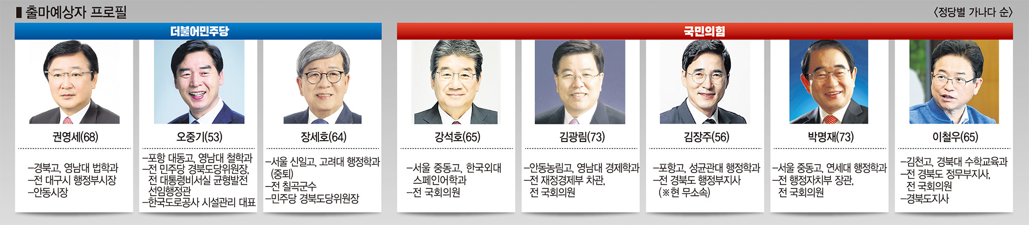 경북도지사 후보 역시 국민의힘 소속이 여권에 비해 상대적으로 많다. 더불어민주당 후보들도 지난 지방선거에서의 선전을 다시 한번 보여주겠다며 의지를 다지고 있다.