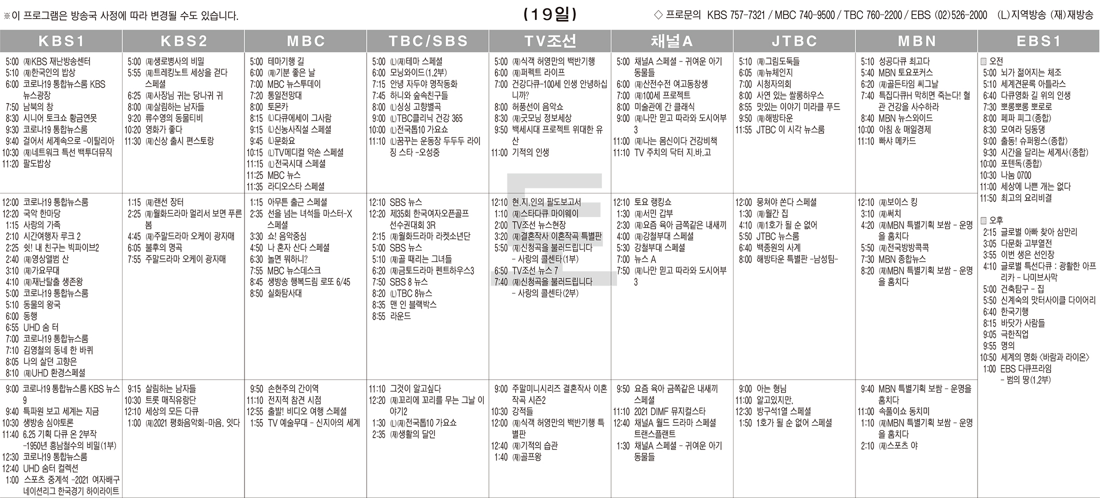 카카오톡 페이스북 트위터 전체 네이버밴드 네이버블로그 6월19일(토) TV 편성표 박성희 기사 전체보기 영남일보(www.yeongnam.com), 무단전재 및 수집, 재배포금지 연예인기뉴스