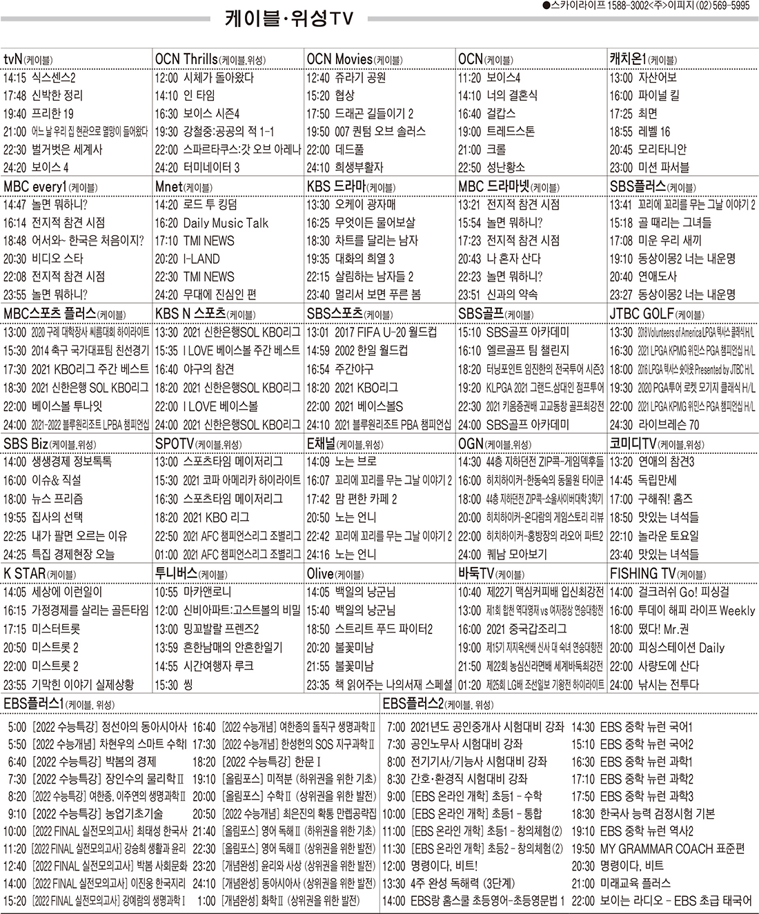 카카오톡 페이스북 트위터 전체 네이버밴드 네이버블로그 6월29일(화) 케이블·위성TV 편성표 박성희 기사 전체보기 영남일보(www.yeongnam.com), 무단전재 및 수집, 재배포금지 연예인기뉴스