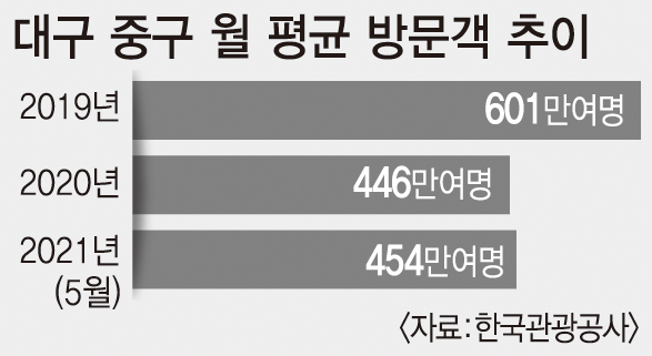 29일 한국관광공사에 따르면, 대구 중구의 월 평균 방문객은 지난 2019년 600만여 명에서 지난해 446만여 명으로 감소했다.