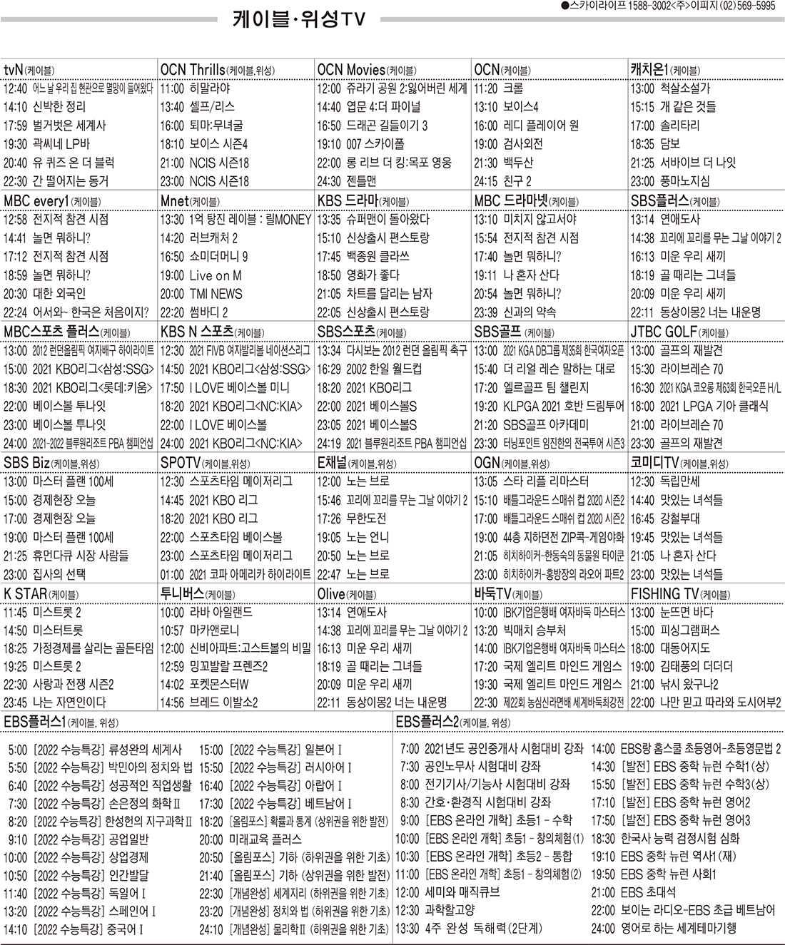카카오톡 페이스북 트위터 전체 네이버밴드 네이버블로그 6월30일(수) 케이블·위성TV 편성표 박성희 기사 전체보기 영남일보(www.yeongnam.com), 무단전재 및 수집, 재배포금지 연예인기뉴스