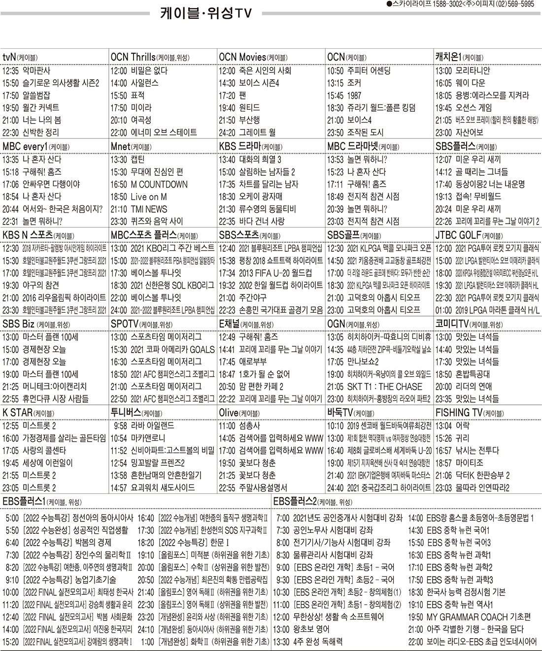 카카오톡 페이스북 트위터 전체 네이버밴드 네이버블로그 7월5일(월) 케이블·위성TV 편성표 박성희 기사 전체보기 영남일보(www.yeongnam.com), 무단전재 및 수집, 재배포금지 연예인기뉴스