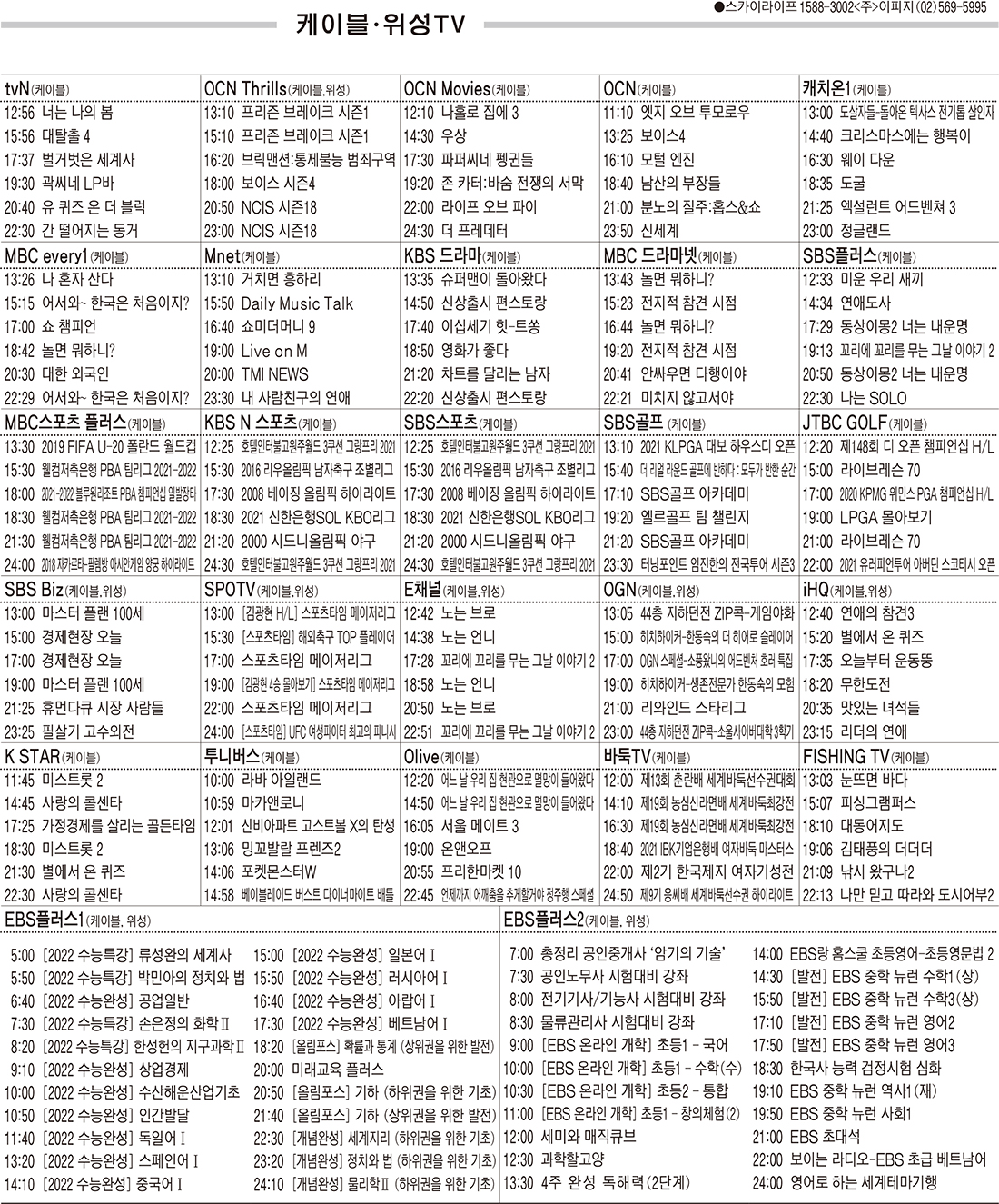 카카오톡 페이스북 트위터 전체 네이버밴드 네이버블로그 7월14일(수) 케이블·위성TV 편성표 박성희 기사 전체보기 영남일보(www.yeongnam.com), 무단전재 및 수집, 재배포금지 연예인기뉴스