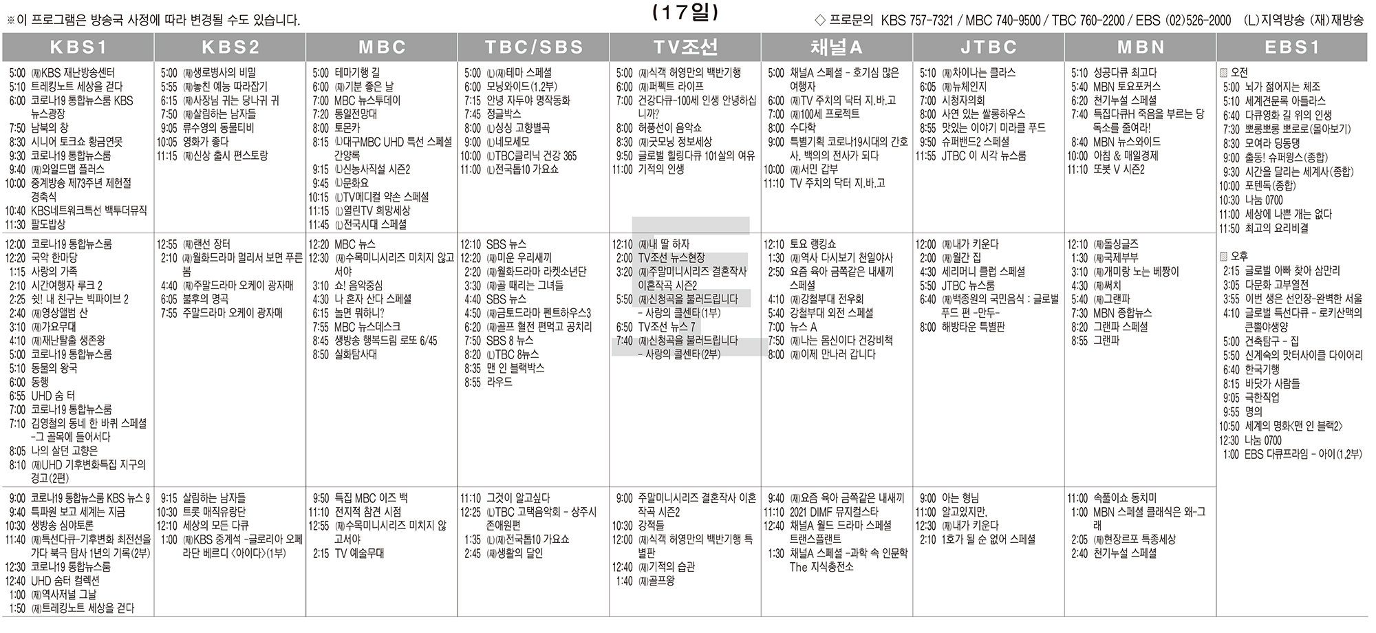 카카오톡 페이스북 트위터 전체 네이버밴드 네이버블로그 7월17일(토) TV 편성표 박성희 기사 전체보기 영남일보(www.yeongnam.com), 무단전재 및 수집, 재배포금지 연예인기뉴스