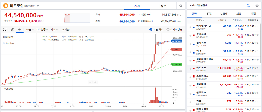 26일 국내 대표적 가상자산거래소 업비트에 따르면, 이날 오전 10시께 비트코인은 4560만 4000원(+11.04%)까지 치솟았다.