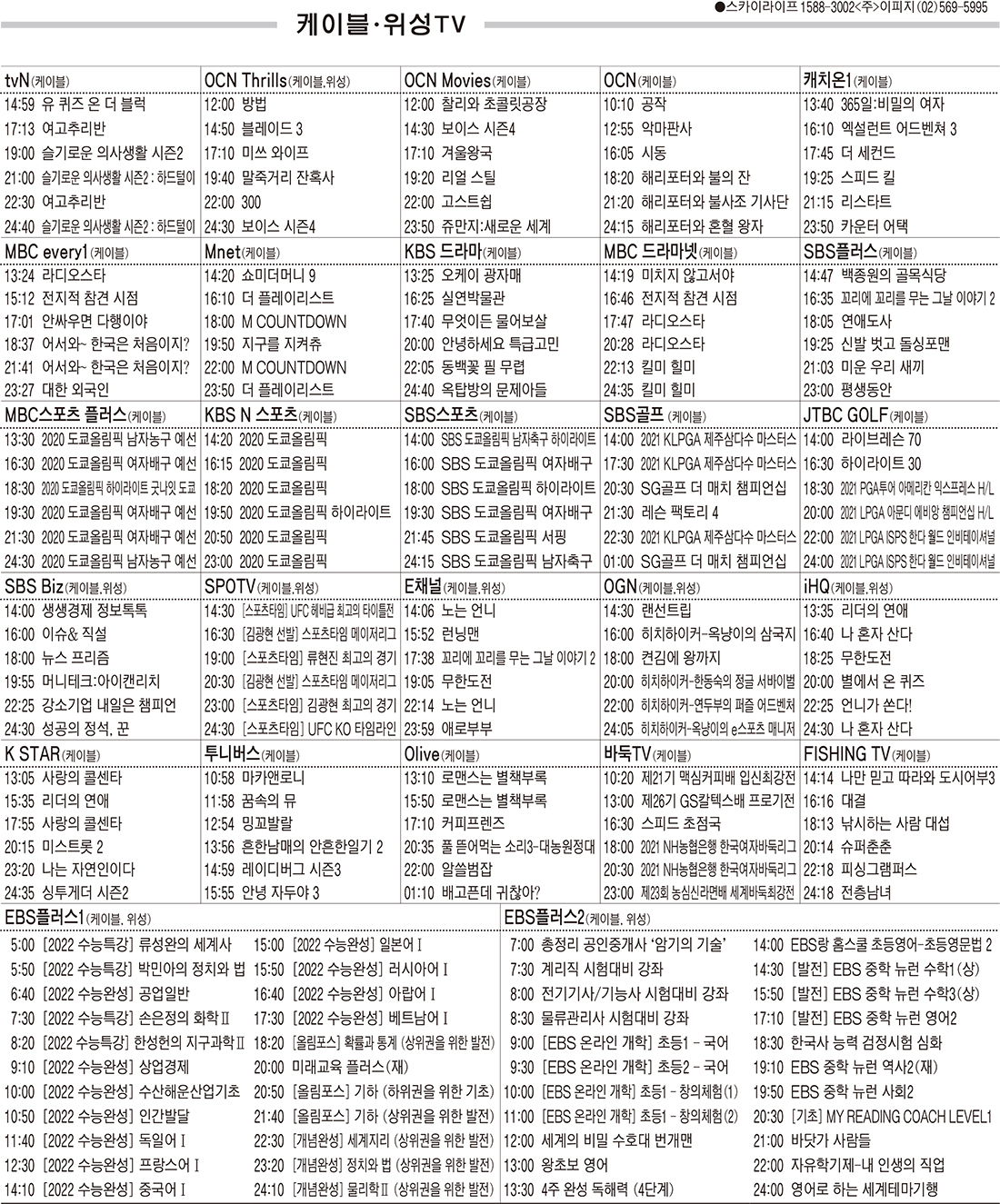 카카오톡 페이스북 트위터 전체 네이버밴드 네이버블로그 7월29일(목) 케이블·위성TV 편성표 박성희 기사 전체보기 영남일보(www.yeongnam.com), 무단전재 및 수집, 재배포금지 연예인기뉴스