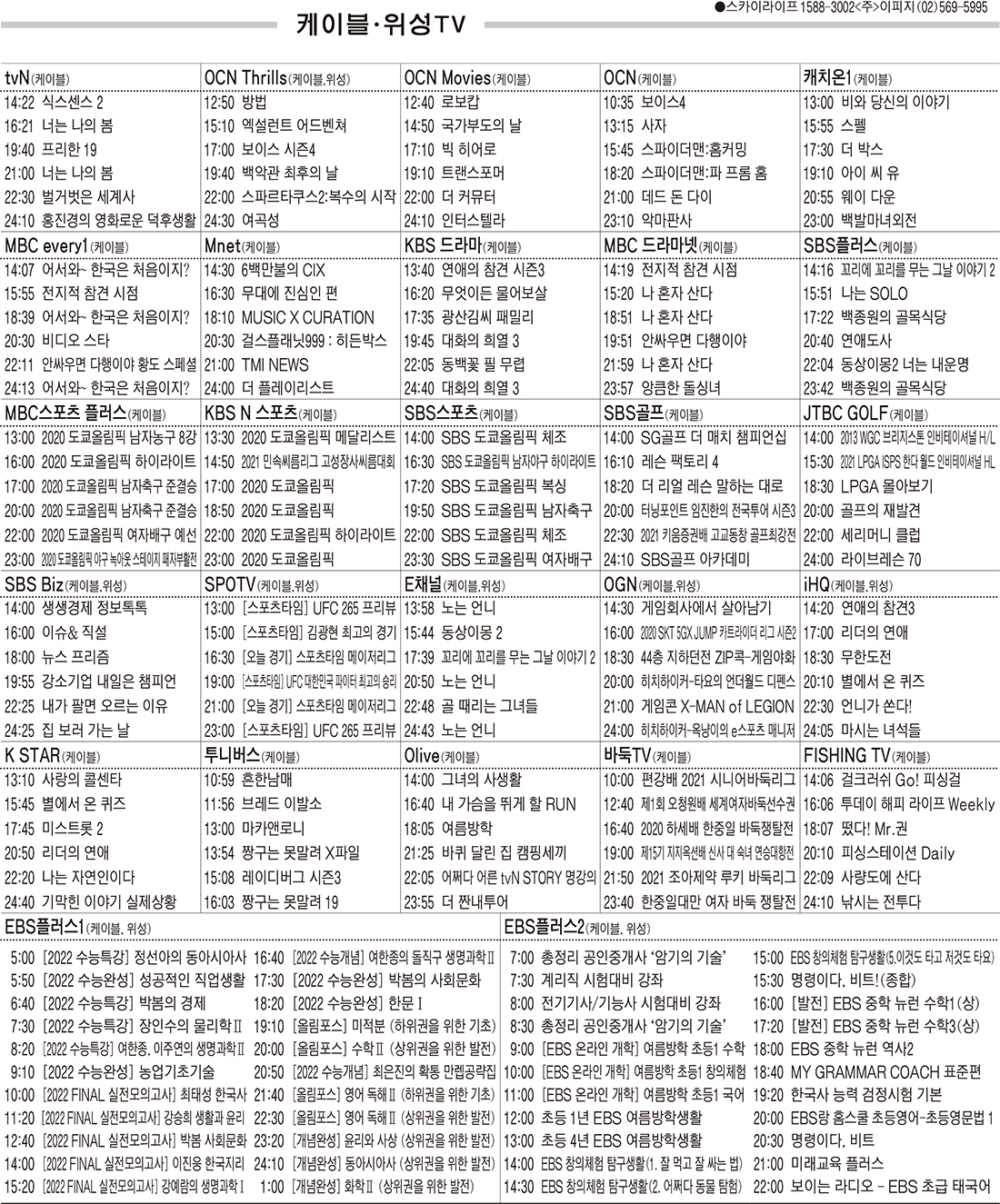 카카오톡 페이스북 트위터 전체 네이버밴드 네이버블로그 8월3일(화) 케이블·위성TV 편성표 박성희 기사 전체보기 영남일보(www.yeongnam.com), 무단전재 및 수집, 재배포금지 연예인기뉴스