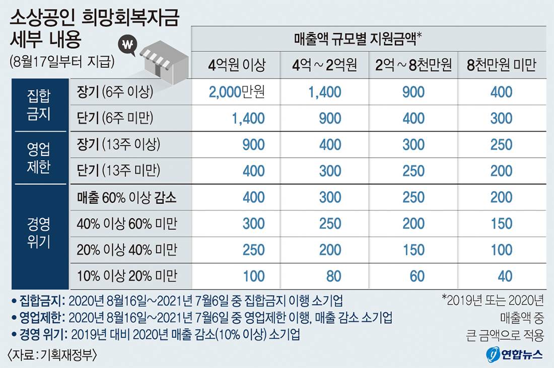 우선 지난해 8월16일부터 올해 7월6일까지 기간 중 집합금지 조치를 이행한 사업체에는 최대 2천만 원이 지원된다. 해당 기간 중 중대본·지방자치단체의 집합금지 이행 기간이 6주 이상인 사업체는 집합금지(장기) 유형으로 2천~400만 원을, 6주 미만인 사업체는 집합금지(단기) 유형으로 1천400만~300만 원을 지원한다.