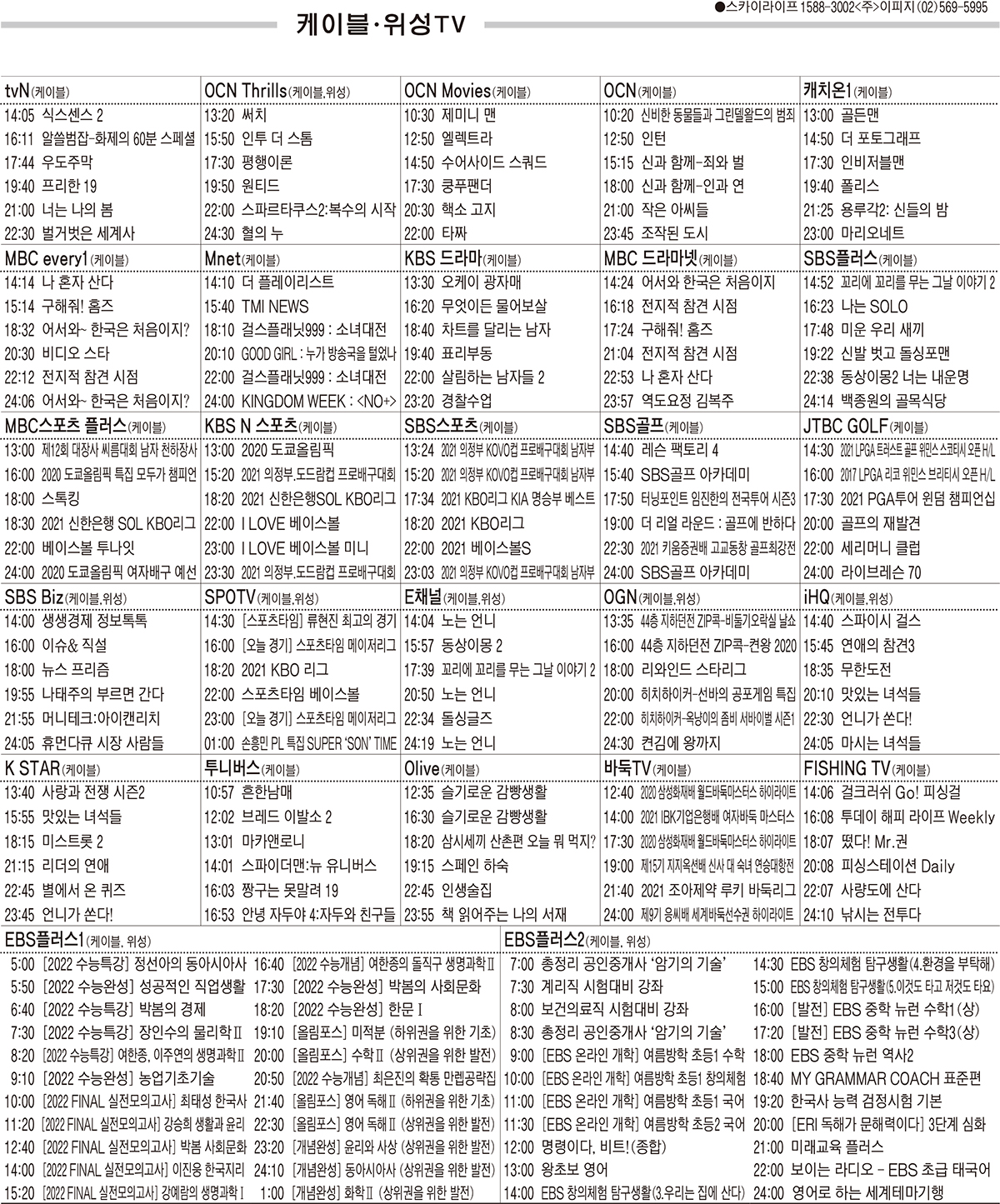 카카오톡 페이스북 트위터 전체 네이버밴드 네이버블로그 8월17일(화) 케이블·위성TV 편성표 박성희 기사 전체보기 영남일보(www.yeongnam.com), 무단전재 및 수집, 재배포금지 연예인기뉴스