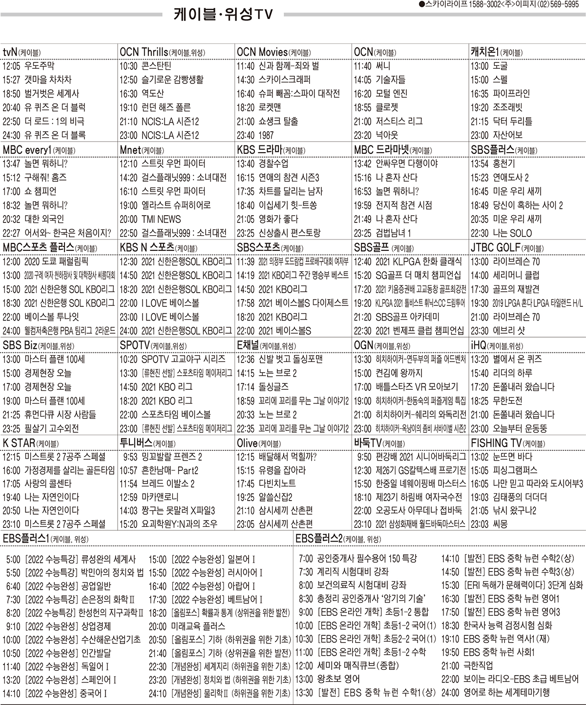 카카오톡 페이스북 트위터 전체 네이버밴드 네이버블로그 9월1일(수) 케이블·위성TV 편성표 박성희 기사 전체보기 영남일보(www.yeongnam.com), 무단전재 및 수집, 재배포금지 연예인기뉴스