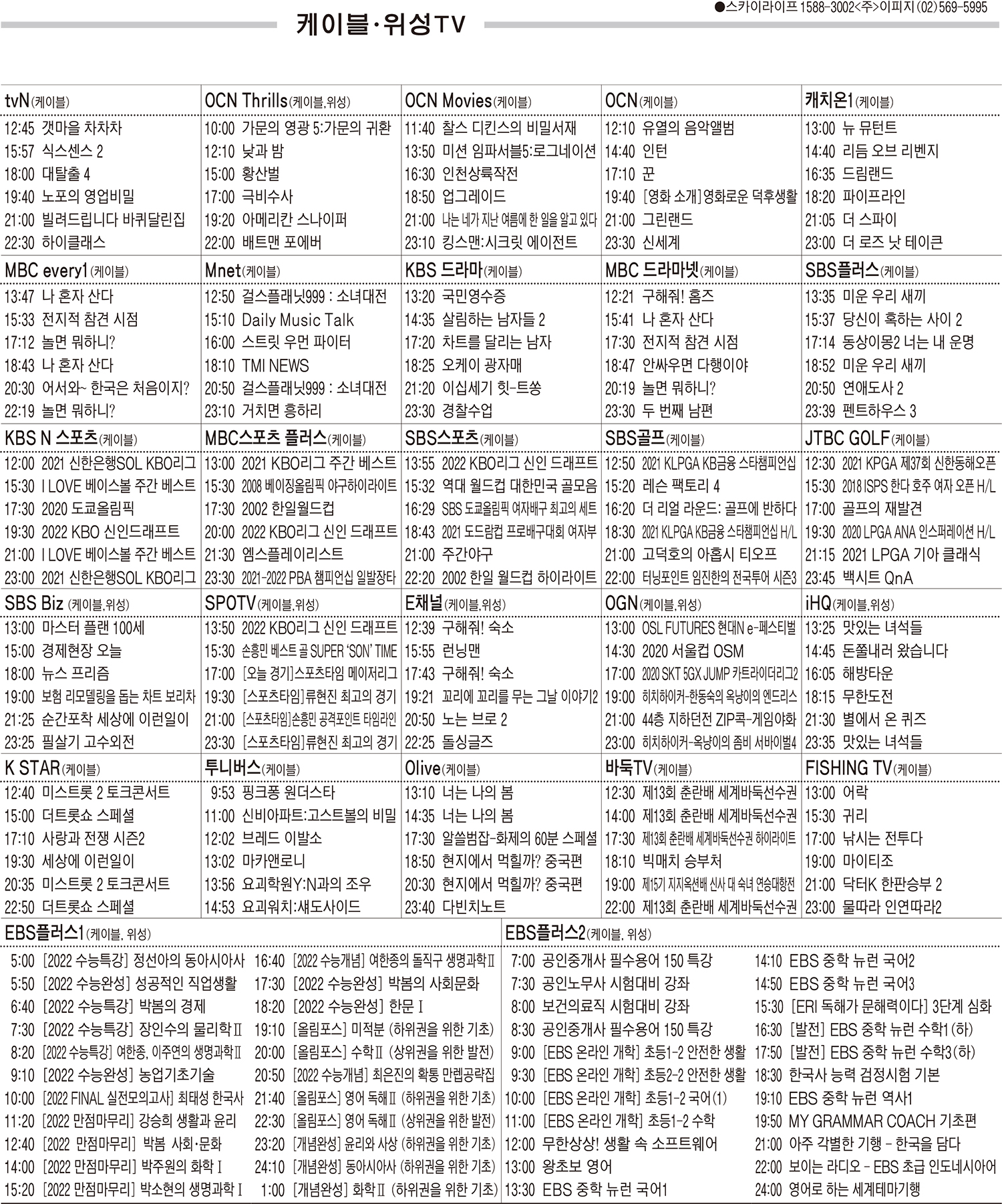 카카오톡 페이스북 트위터 전체 네이버밴드 네이버블로그 9월13일(월) 케이블·위성TV 편성표 박성희 기사 전체보기 영남일보(www.yeongnam.com), 무단전재 및 수집, 재배포금지 연예인기뉴스