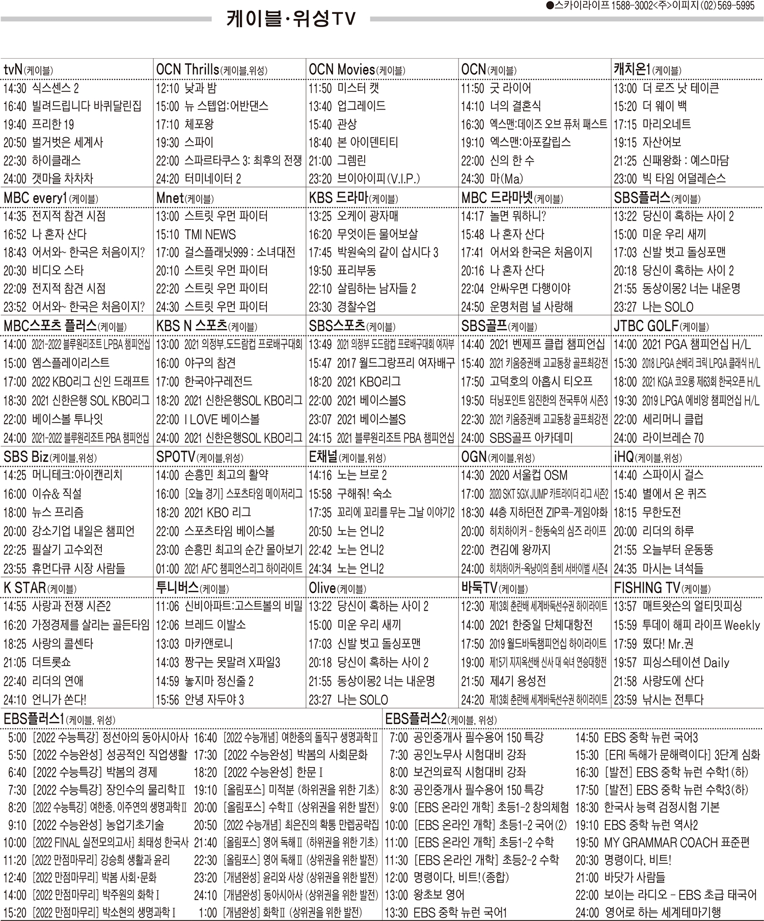 카카오톡 페이스북 트위터 전체 네이버밴드 네이버블로그 9월14일(화) 케이블·위성TV 편성표 박성희 기사 전체보기 영남일보(www.yeongnam.com), 무단전재 및 수집, 재배포금지 연예인기뉴스