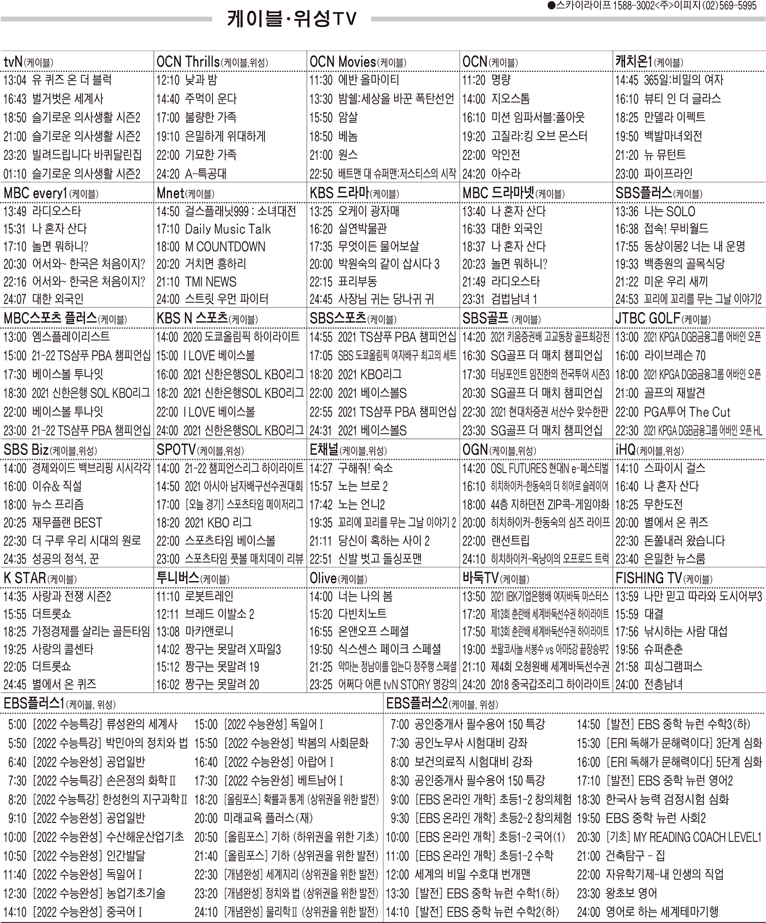 카카오톡 페이스북 트위터 전체 네이버밴드 네이버블로그 9월16일(목) 케이블·위성TV 편성표 박성희 기사 전체보기 영남일보(www.yeongnam.com), 무단전재 및 수집, 재배포금지 연예인기뉴스