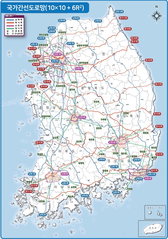 도로 건설의 근간이 되는 국가 간선도로망은 92년 이래로 남북방향의 7개축과 동서방향의 9개축으로 구성된 격자망과 대도시 권역의 6개의 순환망으로 운영(7×9 + 6R)됐으나, 이번 계획을 통해 30여 년 만에 남북방향의 10개축, 동서방향의 10개축과 6개의 방사형 순환망(10×10 + 6R2) 체계로 재정비됐다.
