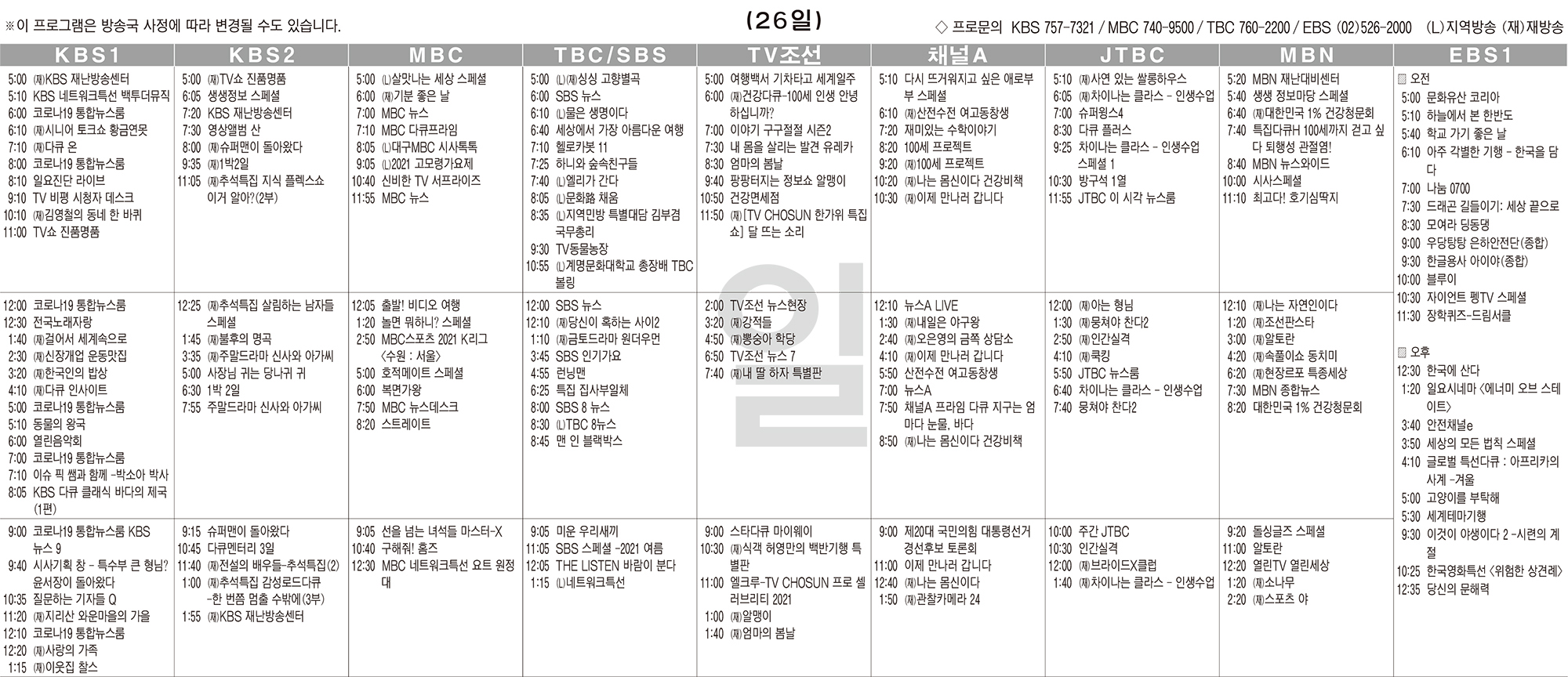 카카오톡 페이스북 트위터 전체 네이버밴드 네이버블로그 9월26일(일) TV 편성표 박성희 기사 전체보기 영남일보(www.yeongnam.com), 무단전재 및 수집, 재배포금지 연예인기뉴스