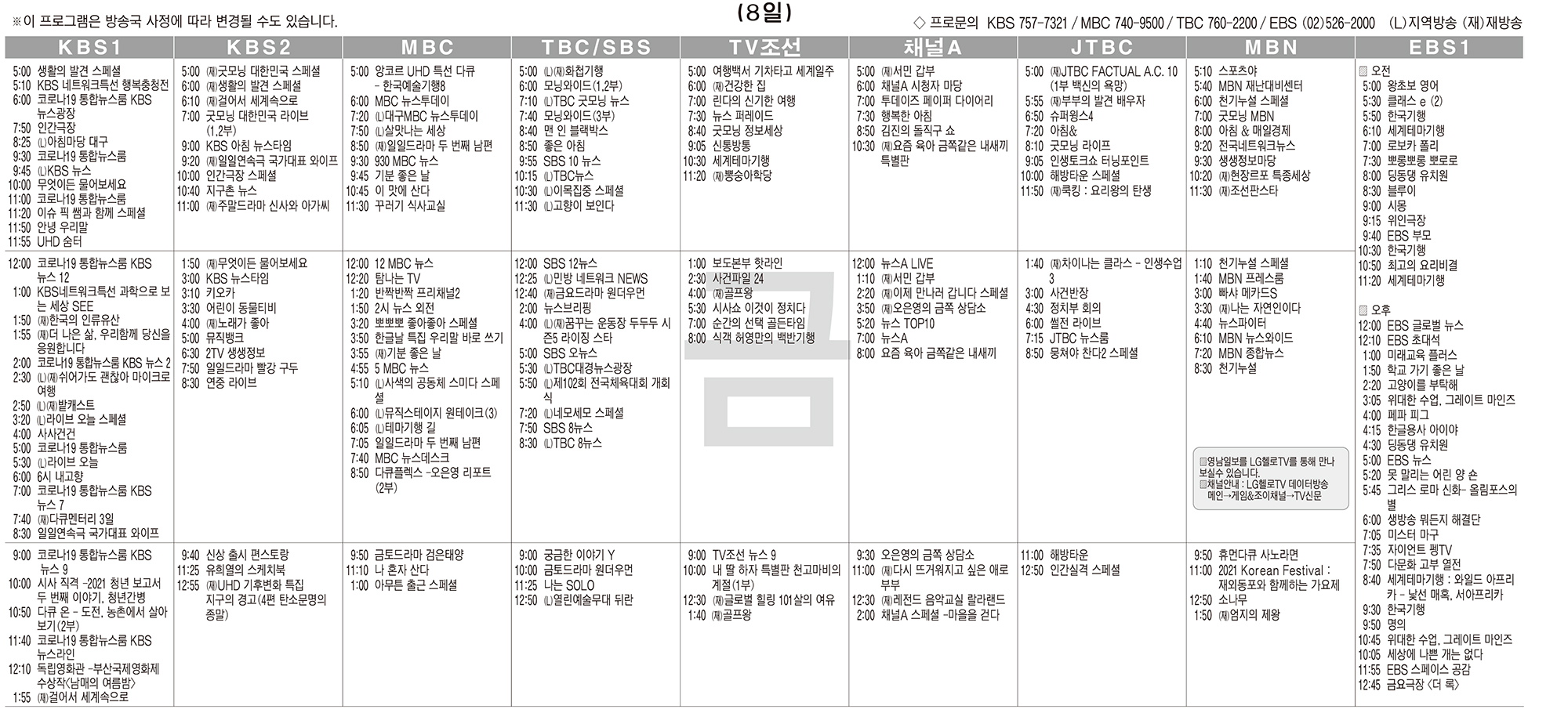 카카오톡 페이스북 트위터 전체 네이버밴드 네이버블로그 10월8일(금) TV 편성표 박성희 기사 전체보기 영남일보(www.yeongnam.com), 무단전재 및 수집, 재배포금지 연예인기뉴스