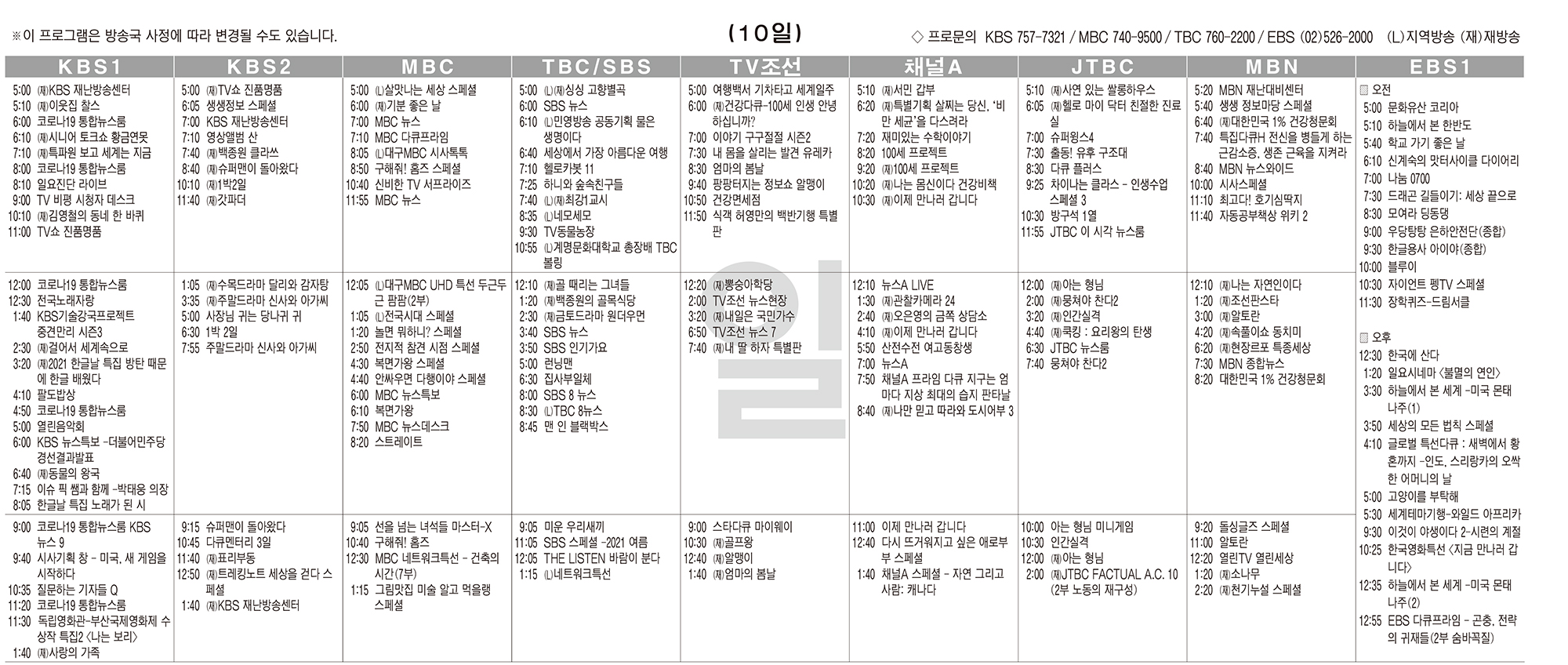 카카오톡 페이스북 트위터 전체 네이버밴드 네이버블로그 10월10일(일) TV 편성표 박성희 기사 전체보기 영남일보(www.yeongnam.com), 무단전재 및 수집, 재배포금지 연예인기뉴스