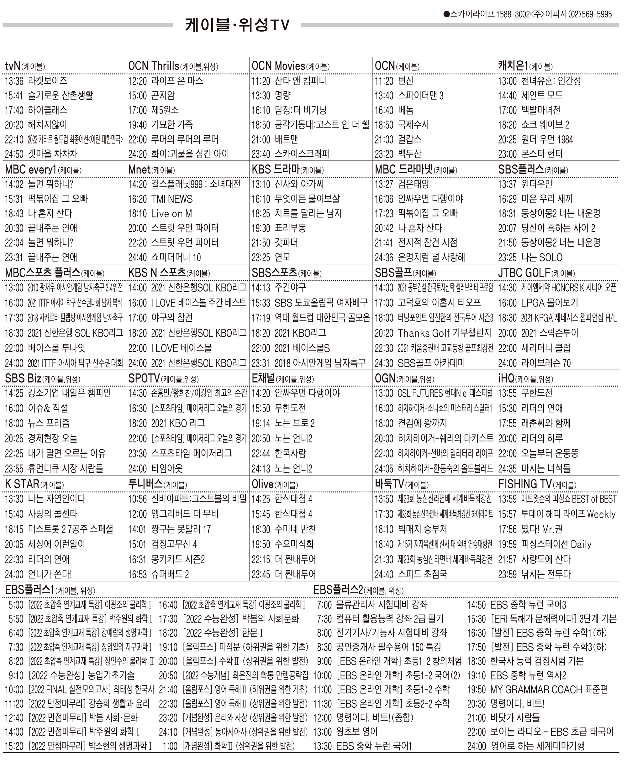 카카오톡 페이스북 트위터 전체 네이버밴드 네이버블로그 10월12일(화) 케이블·위성TV 편성표 박성희 기사 전체보기 영남일보(www.yeongnam.com), 무단전재 및 수집, 재배포금지 연예인기뉴스