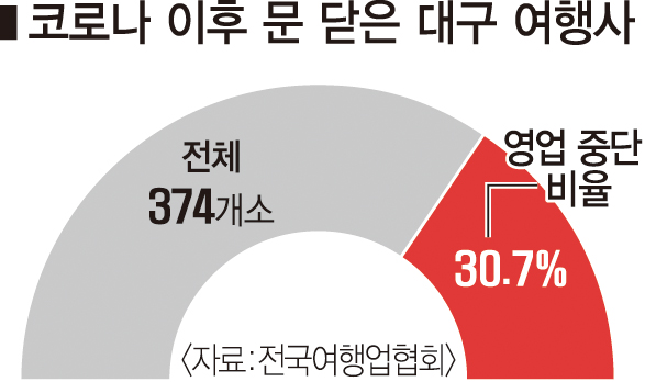 현재 대구지역 여행업체 3곳 중 1곳은 사실상 '영업 중단' 상태이다. 전국여행업협회 '전국 여행업체 실태 전수조사'에 따르면, 대구 여행업체 374개소 중 30.7%가 코로나19 이후 영업을 중단했다. 대구시에 따르면, 지난해 1월부터 올해 상반기까지 여행업체 28개소가 폐업했다.