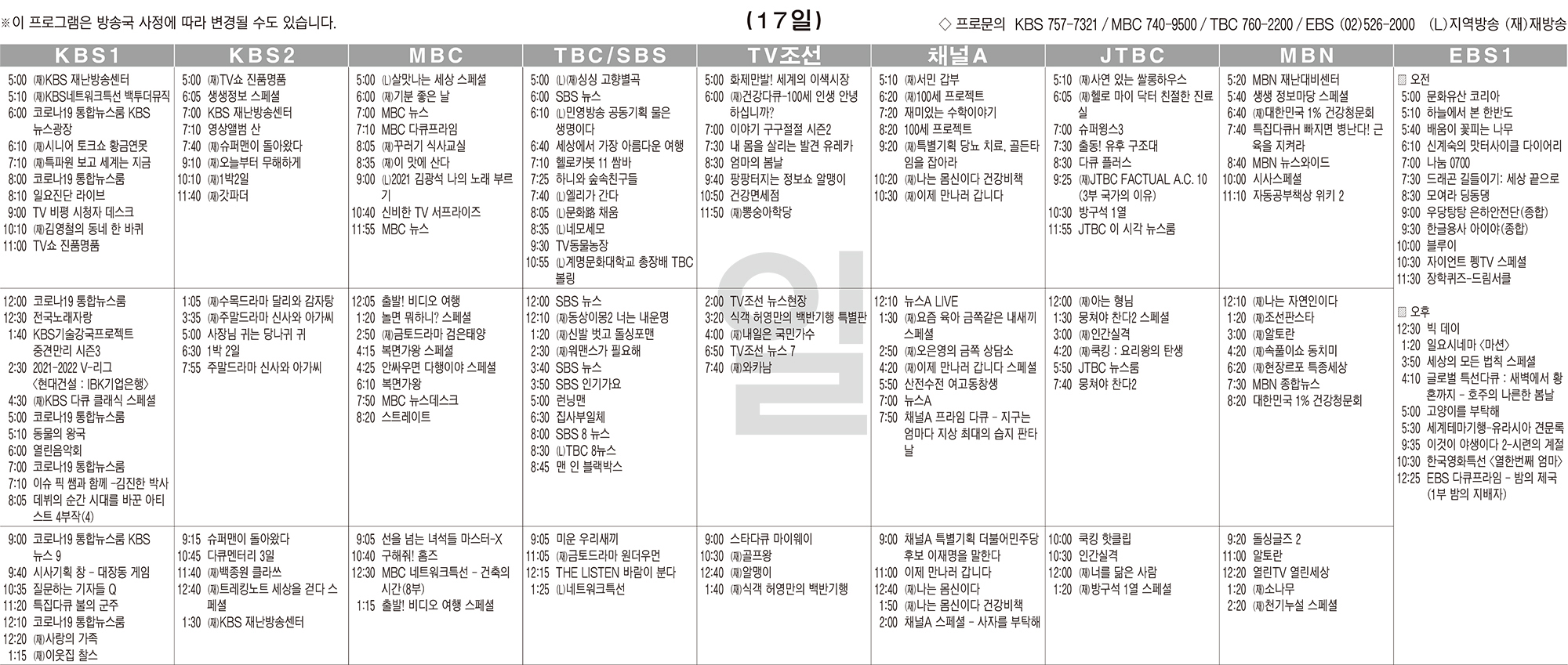카카오톡 페이스북 트위터 전체 네이버밴드 네이버블로그 10월17일(일) TV 편성표 박성희 기사 전체보기 영남일보(www.yeongnam.com), 무단전재 및 수집, 재배포금지 연예인기뉴스