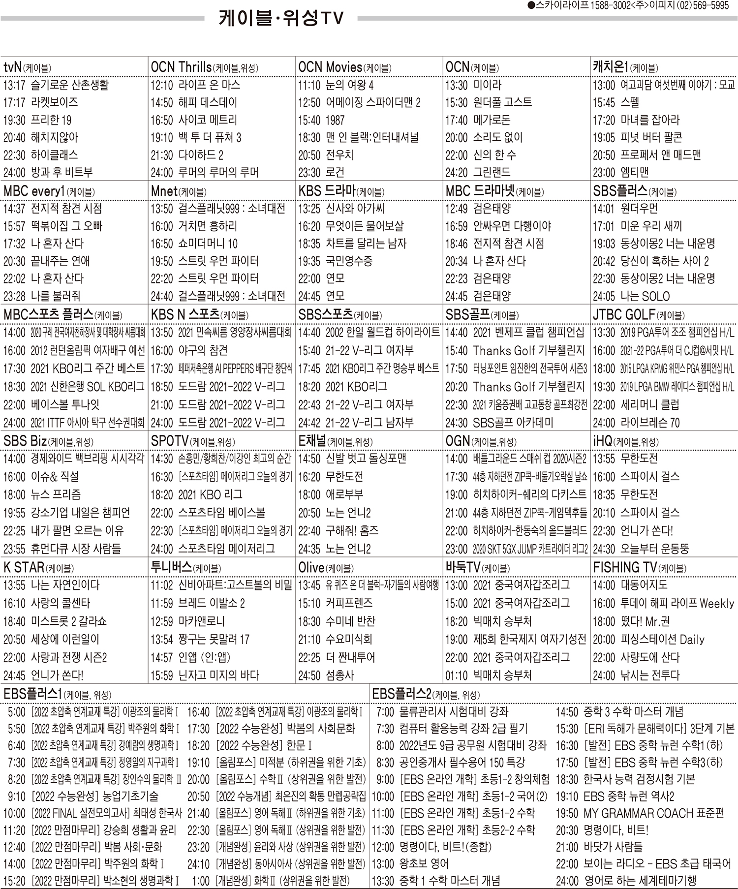 카카오톡 페이스북 트위터 전체 네이버밴드 네이버블로그 10월19일(화) 케이블·위성TV 편성표 박성희 기사 전체보기 영남일보(www.yeongnam.com), 무단전재 및 수집, 재배포금지 연예인기뉴스