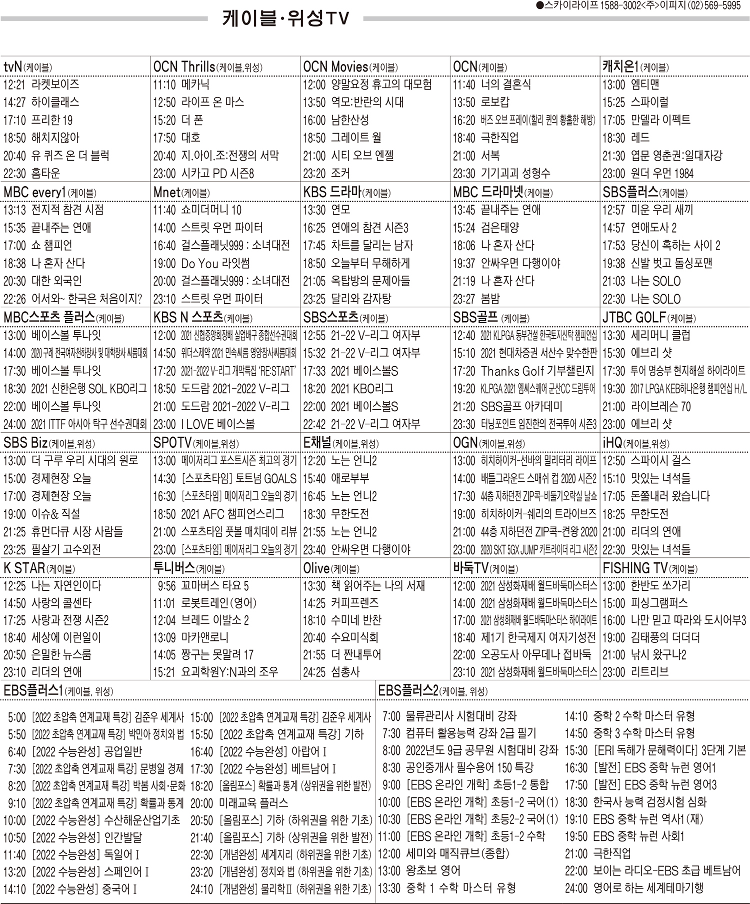 카카오톡 페이스북 트위터 전체 네이버밴드 네이버블로그 10월20일(수) 케이블·위성TV 편성표 박성희 기사 전체보기 영남일보(www.yeongnam.com), 무단전재 및 수집, 재배포금지 연예인기뉴스
