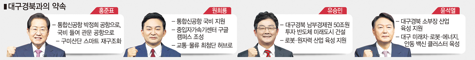 후보들은 '보수의 심장'으로 불리는 TK 지역 TV 토론회에서 "문재인 대통령은 여적죄", "이재명은 위선·독재자"라며 서로 정권교체의 적자라는 점을 강조했다. 특히 홍준표 후보와 윤석열 후보는 토론에서 TK 지역이 낳은 두 대통령의 수사를 두고 정면 충돌하는 모습을 연출했고, 유승민 후보는 자신이 대구의 아들임을 강조하며 지지를 호소했다. 원희룡 후보는 토론 중간중간 박정희 대통령을 '용인술의 대가'라고 지칭하며 지역민의 마음을 얻으려고 노력했다.