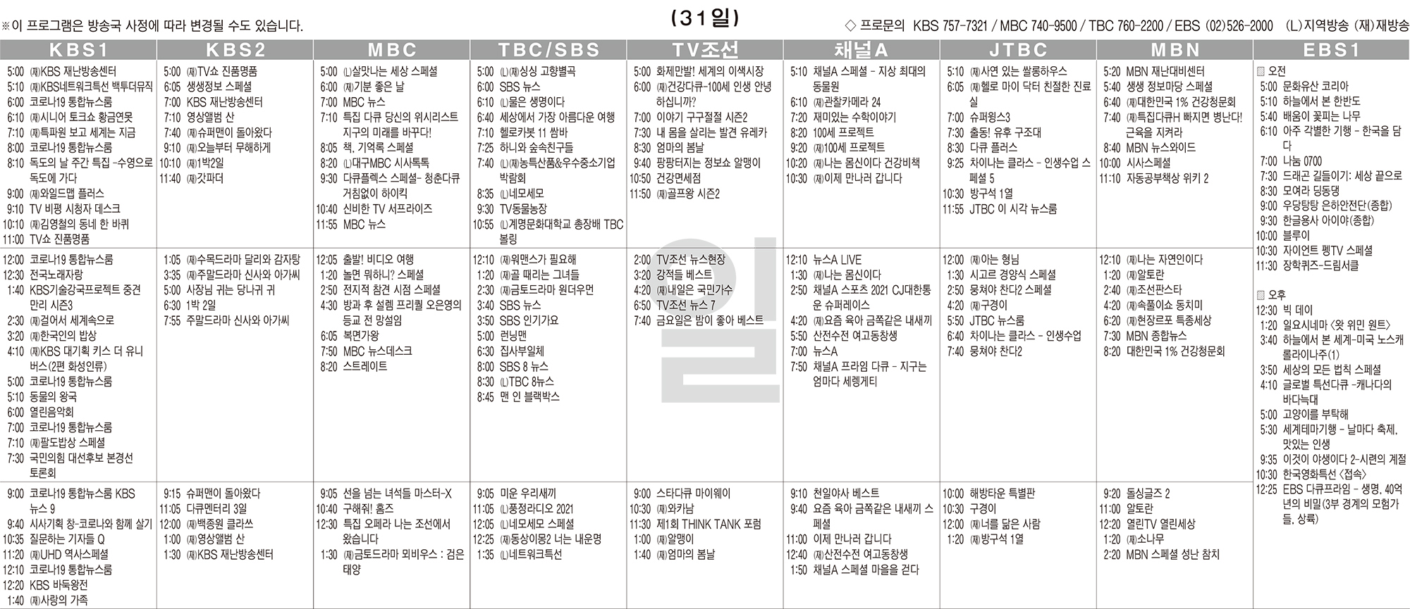 카카오톡 페이스북 트위터 전체 네이버밴드 네이버블로그 10월31일(일) TV 편성표 박성희 기사 전체보기 영남일보(www.yeongnam.com), 무단전재 및 수집, 재배포금지 연예인기뉴스