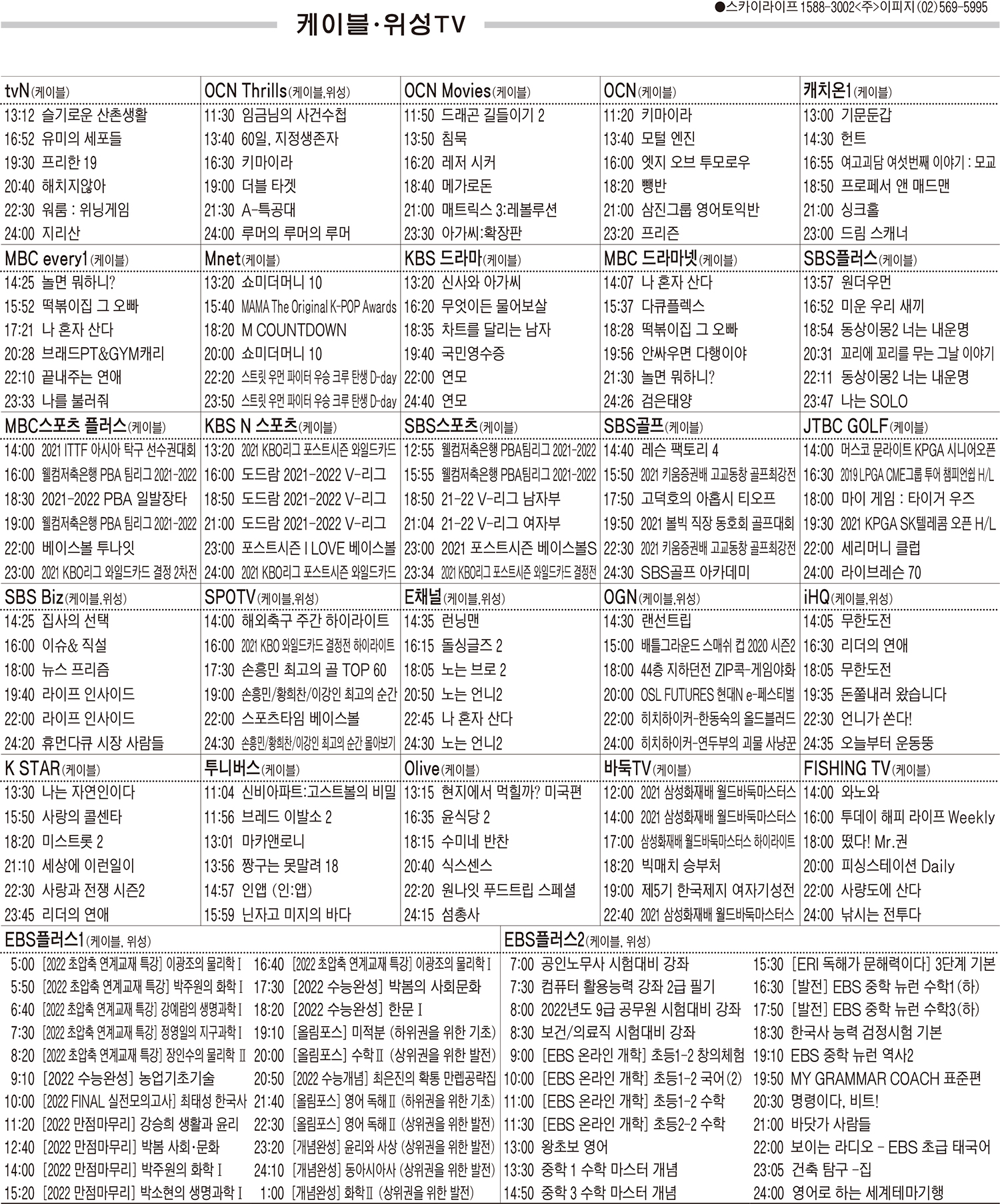 카카오톡 페이스북 트위터 전체 네이버밴드 네이버블로그 11월2일(화) 케이블·위성TV 편성표 박성희 기사 전체보기 영남일보(www.yeongnam.com), 무단전재 및 수집, 재배포금지 연예인기뉴스