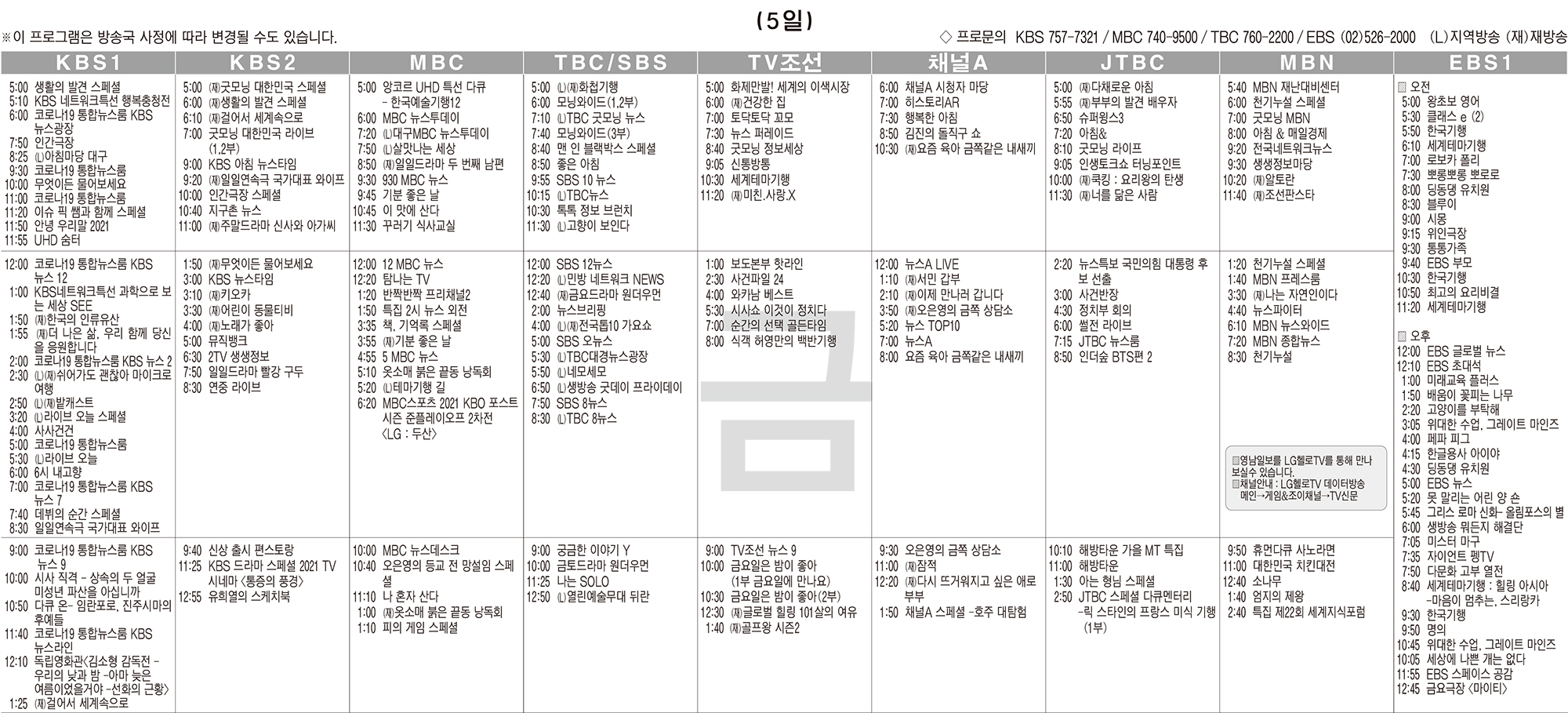 카카오톡 페이스북 트위터 전체 네이버밴드 네이버블로그 11월5일(금) TV 편성표 박성희 기사 전체보기 영남일보(www.yeongnam.com), 무단전재 및 수집, 재배포금지 연예인기뉴스